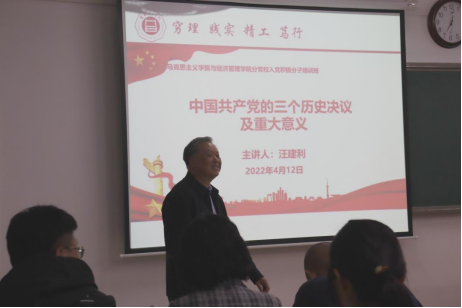 为了切实提升马克思主义学院与经济管理学院首届入党积极分子培训班学员的培训质量,按照学校和学院的培训计划,2022年4月12日晚,在二教422教室,伟德国际victor1946官网副校长汪建利同志来到马克思主义学院与经济管理学院分党校入党积极分子培训班,受邀对学员进行题为《中国共产党的三个历史决议及重大意义》的党课培训。本次活动由马克思主义学院与经济管理学分党校负责人、党总支书记吴玲院长主持,总支各个党支部书记及全体入党积极分子培训班全体学员参加。