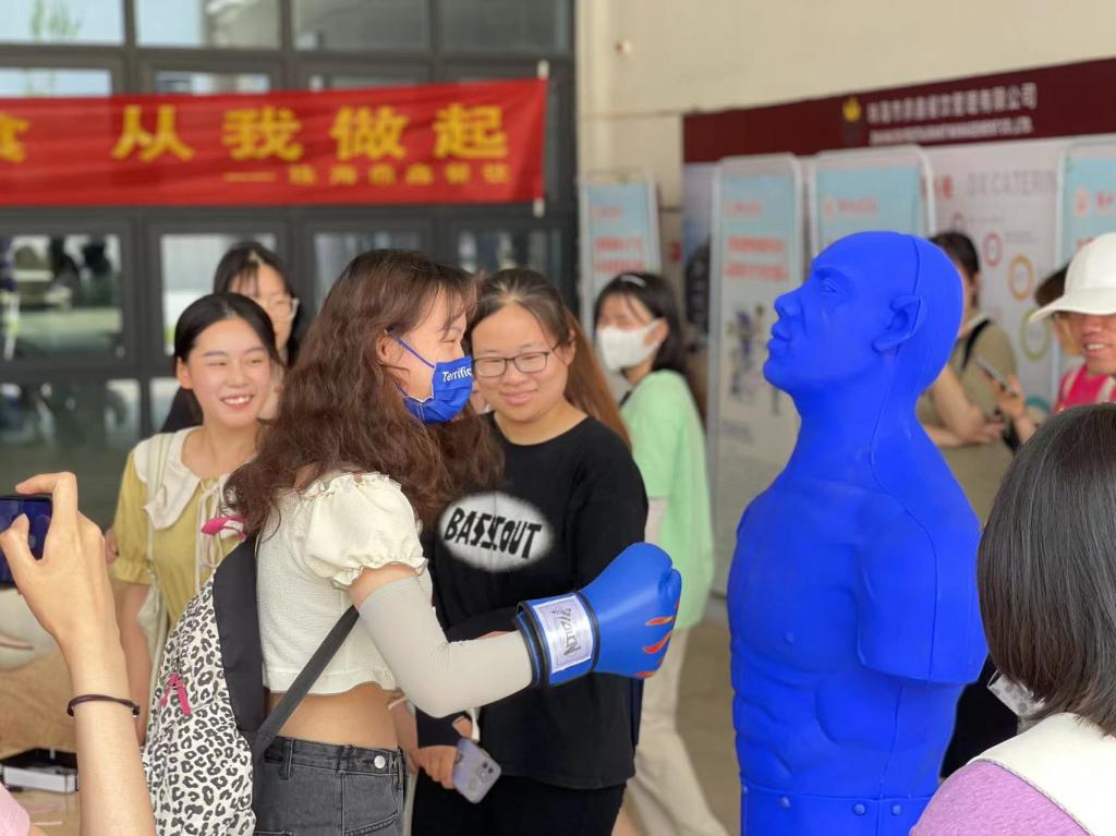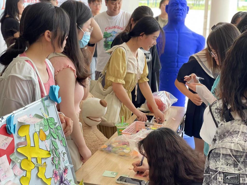 本次活动分三个板块进行:丢掉生活的不愉快;给生活加点糖;写下美好的祝愿。“丢掉生活的不愉快”——同学们通过拍打“蓝色小人”宣泄柱,释放心理压力,缓解不愉快的情绪。给生活加点糖——心理协会的工作人员穿着玩偶服给同学们送去气球、糖果以及温暖的抱抱,提醒大家要好好爱自己。写下美好的祝愿——同学们用小纸条写下自己的愿望和“心里话”,贴在展板上,表达自己对美好生活的期待与向往。