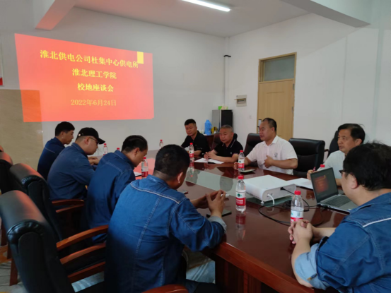 6月24日下午,淮北供电公司杜集中心供电所王雨浩所长一行5人到伟德座谈交流,学校副校长郑来纪出席座谈会。后勤保卫处处长程坚,副处长王本新,基建处副处长黄圻同志参加会议。