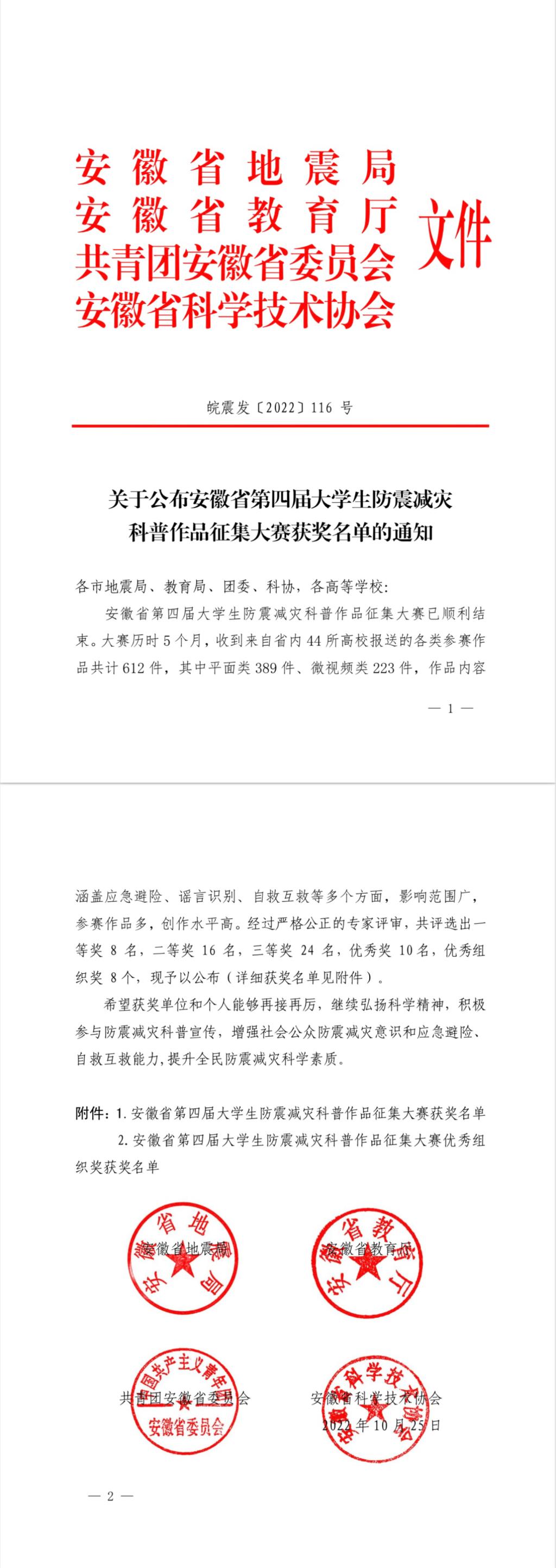 为全面贯彻习近平总书记关于防灾减灾救灾和科学普及重要论述精神,弘扬科学精神,提升全民防震减灾科学素质。由省地震局、省教育厅、团省委、省科协共同主办,安徽省地震局信息中心承办的安徽省第四届大学生防震减灾科普作品征集大赛顺利落下帷幕。伟德在大赛中荣获优秀组织奖,报送的学生作品《防震减灾,珍爱生命》(作者:淑娴)荣获优秀奖。