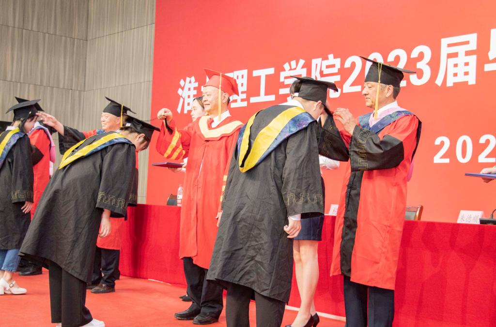 在欢快的乐曲与热烈的掌声中,校领导、各二级学院院长为2023届毕业生代表颁发学位证书并行拨穗礼。