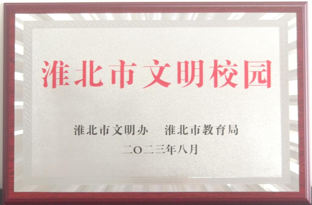 在淮北市委宣传部,淮北市精神文明建设指导委员会办公室、淮北市教育局大力支持下,在学校文明校园创建工作领导小组和全校师生员工的共同努力下,经过文明校园申报、考核组实地考察等环节,学校顺利通过各项审核,被授予“第三届淮北市文明校园”荣誉称号。