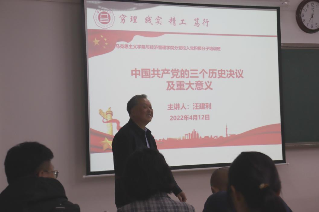 为了切实提升马克思主义学院与经济管理学院首届入党积极分子培训班学员的培训质量,按照学校和学院的培训计划,4月12日晚,在二教422教室,伟德国际victor1946官网副校长汪建利同志来到马克思主义学院与经济管理学院分党校入党积极分子培训班,受邀对学员进行题为《中国共产党的三个历史决议及重大意义》的党课培训。本次活动由马克思主义学院与经济管理学分党校负责人、党总支书记吴玲院长主持,总支各个党支部书记及全体入党积极分子培训班全体学员参加。