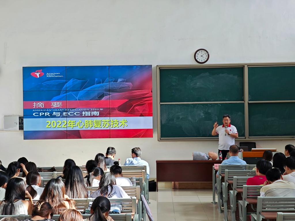 本次培训的主题是普及应急救护知识与技能。王志远老师采用图像资料演示和道具体验等理论与实操相结合的形式,直观地向师生讲解了心脏复苏术(CPR)、自动体外除颤器(AED)的具体操作流程和注意事项,介绍了海姆立克急救法等气道异物的处理方法,为师生员工提供了急救操作范本。
