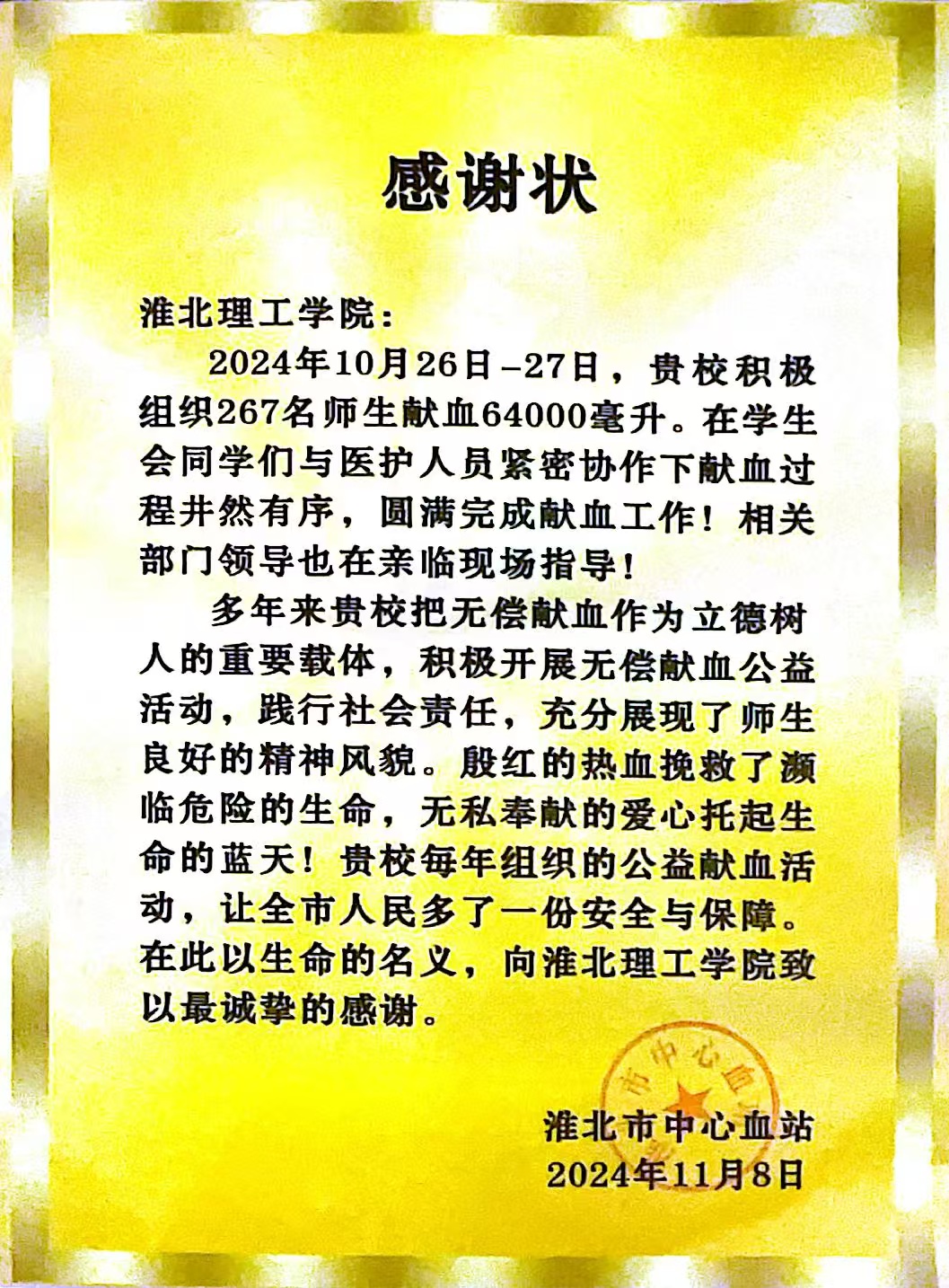 近日,伟德国际victor1946官网收到淮北市中心血站“感谢状”,感谢学校一直以来积极组织师生参与无偿献血,用热血共筑生命希望,奉献爱心,为社会播种温暖力量。
