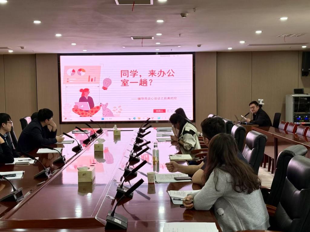 吴天一以《“同学,来办公室一趟?”——辅导员谈心谈话之距离把控》为主题,提炼“群体-个体”双维谈话策略:群体沟通按“通知-任务-信息-疏导”梯度推进,个体谈心以“一杯茶的距离”建立信任。分享过程中他强调辅导员要把握谈心谈话的艺术,将价值观引导融入日常关怀,“谈”要有度、“谈”要有法、“谈”要有序。