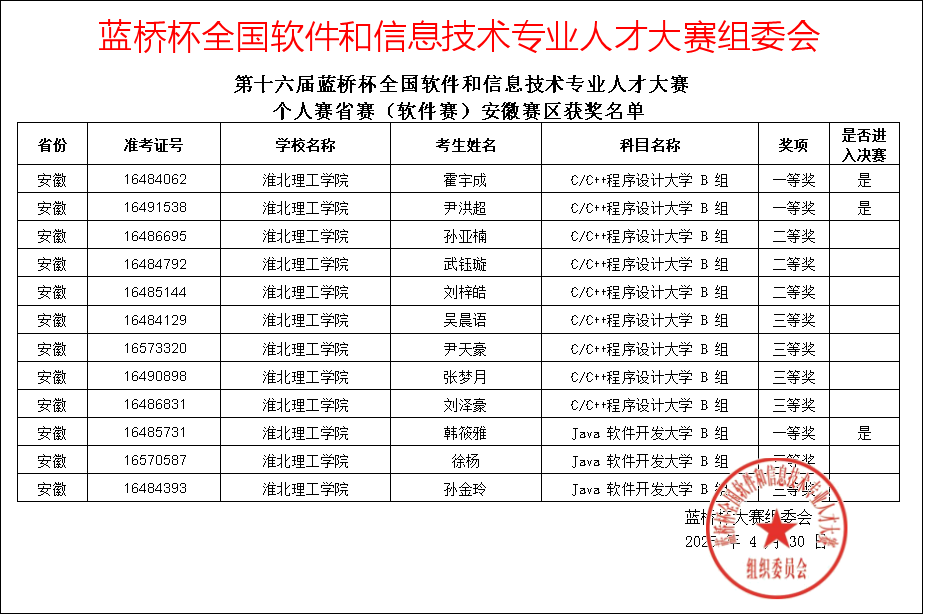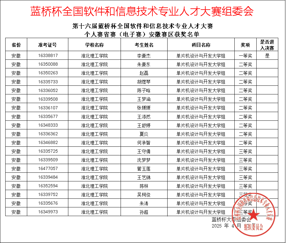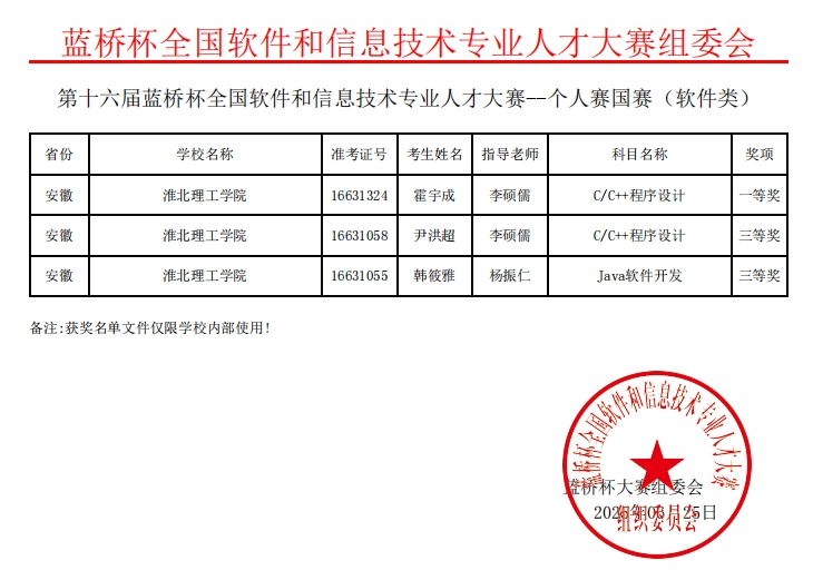 伟德电子与信息工程学院学子凭借扎实专业功底在第十六届“蓝桥杯”全国软件和信息技术专业人才大赛全国总决赛中,获国家一等奖1项、国家二等奖1项、国家三等奖2项;在第十六届“蓝桥杯”全国软件和信息技术专业人才大赛安徽赛区,获省级一等奖4项、省级二等奖14项、省级三等奖13项。