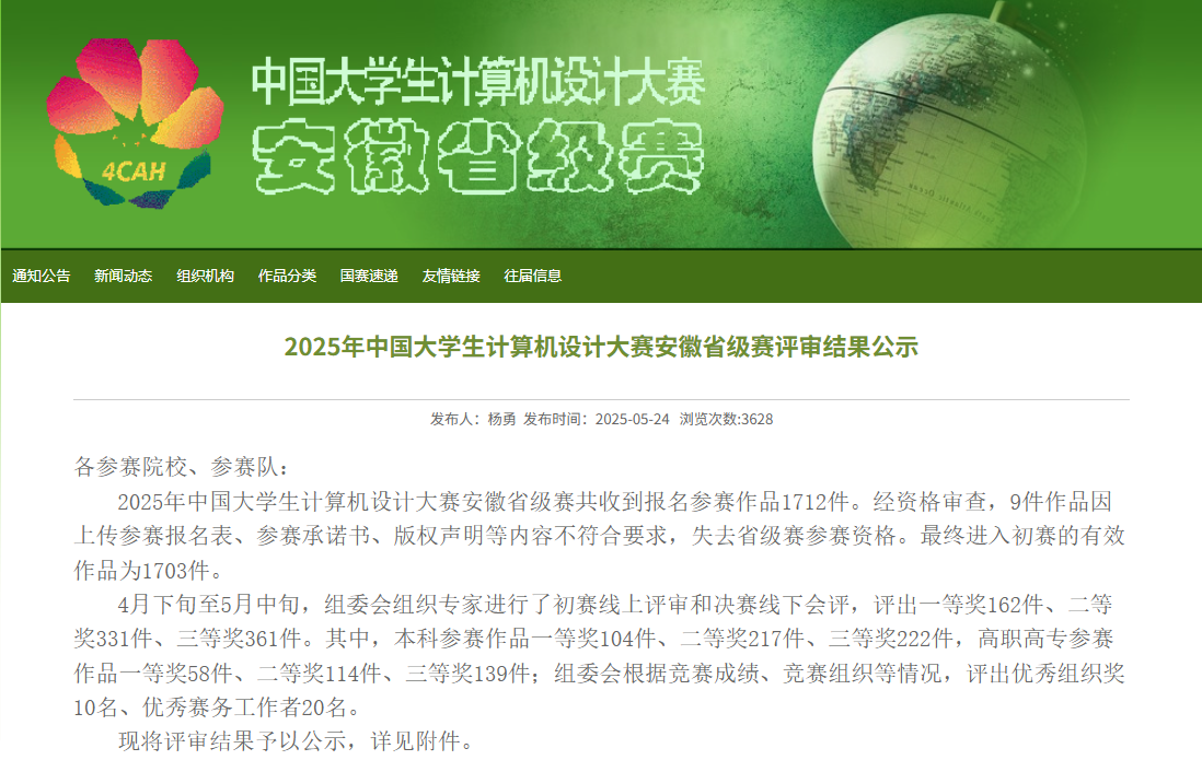 中国大学生计算机设计大赛作为全国性重要学科竞赛,旨在推动高校计算机教学改革,提升学生创新能力与实践水平。本次安徽省级赛吸引了全省多所高校的优秀团队参赛,竞争激烈。我院参赛团队从选题策划、技术研发到作品打磨,历经数月精心准备,经过严苛的校赛选拔,派出12个队参加省级竞赛,最终在软件应用与开发、物联网应用等多个省级赛道中脱颖而出。在软件应用与开发赛道张梦月等同学获得一等奖1项、尹鹏等同学获得二等奖1项;在物联网应用赛道姜婷婷等同学和吴奇豪等同学分别获一等奖各1项;在微课与AI辅助教学赛道罗会苏等同学和尹鹏等同学分别获得二等奖各1项;在计算机音乐创作赛道李子恒等同学获得三等奖1项,获优胜奖3项。向所有获奖同学和指导教师表示祝贺!期待未来学子们在各类赛事中续写辉煌!