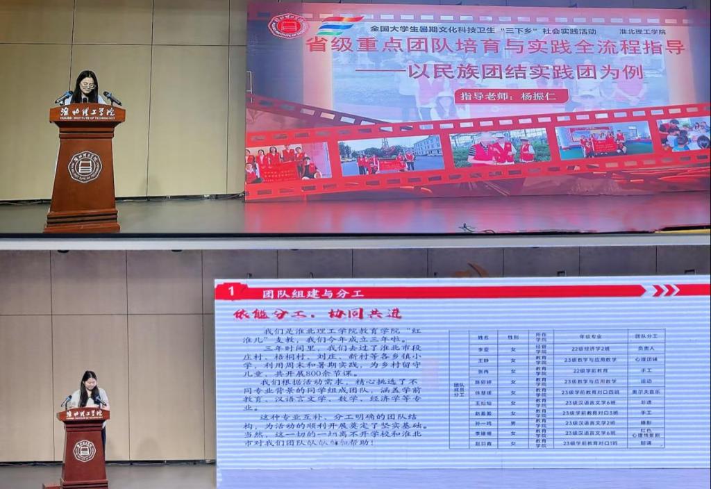 2024年全省优秀团队—伟德国际victor1946官网赴合肥市肥东县牌坊回族满族乡民族团结实践团,2024年全国优秀团队—伟德国际victor1946官网支教社赴梧桐村“七彩假期 ,筑梦“红淮””支教实践团分别进行了实践汇报和经验分享。