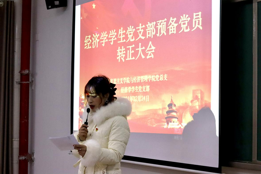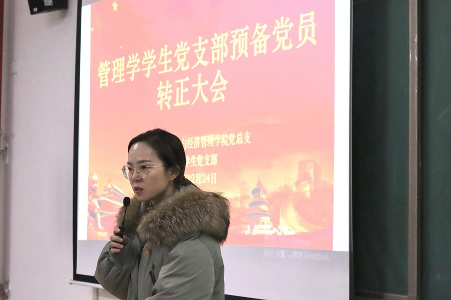 为进一步健全和规范基层党支部的组织建设,增强党支部生机与活力,2021年12月24日下午,马克思主义学院与经济管理学院经济学和管理学学生党支部在二号教学楼412教室召开了预备党员转正大会。两个支部的全体党员参加会议,会议分别由经济学学生党支部负责人员禹辛、管理学学生党支部负责人苗青青主持,院长吴玲和经管学院的相关教工党员列席了会议。