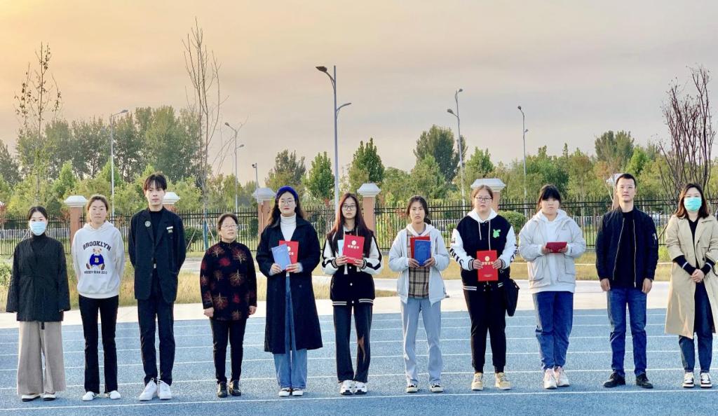 升旗礼毕。教育学院团总支负责人黄莹莹宣读了2022级普通本科班级参加《学生手册》测试获一二三等奖同学名单,并进行了颁奖活动,学院分管副书记孟向红为彭诗琦等5名同学进行颁奖。