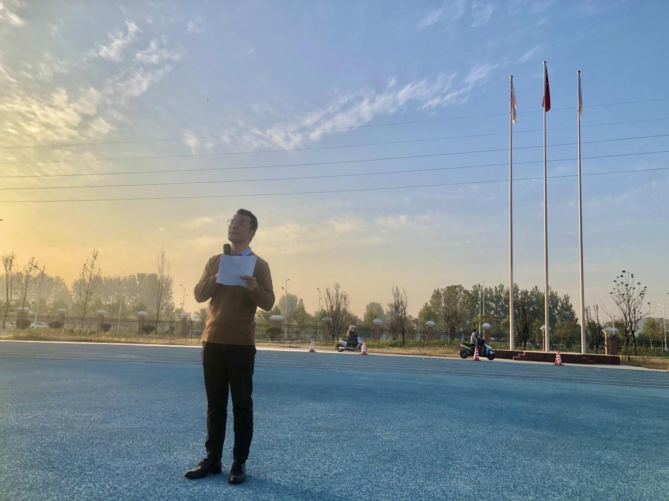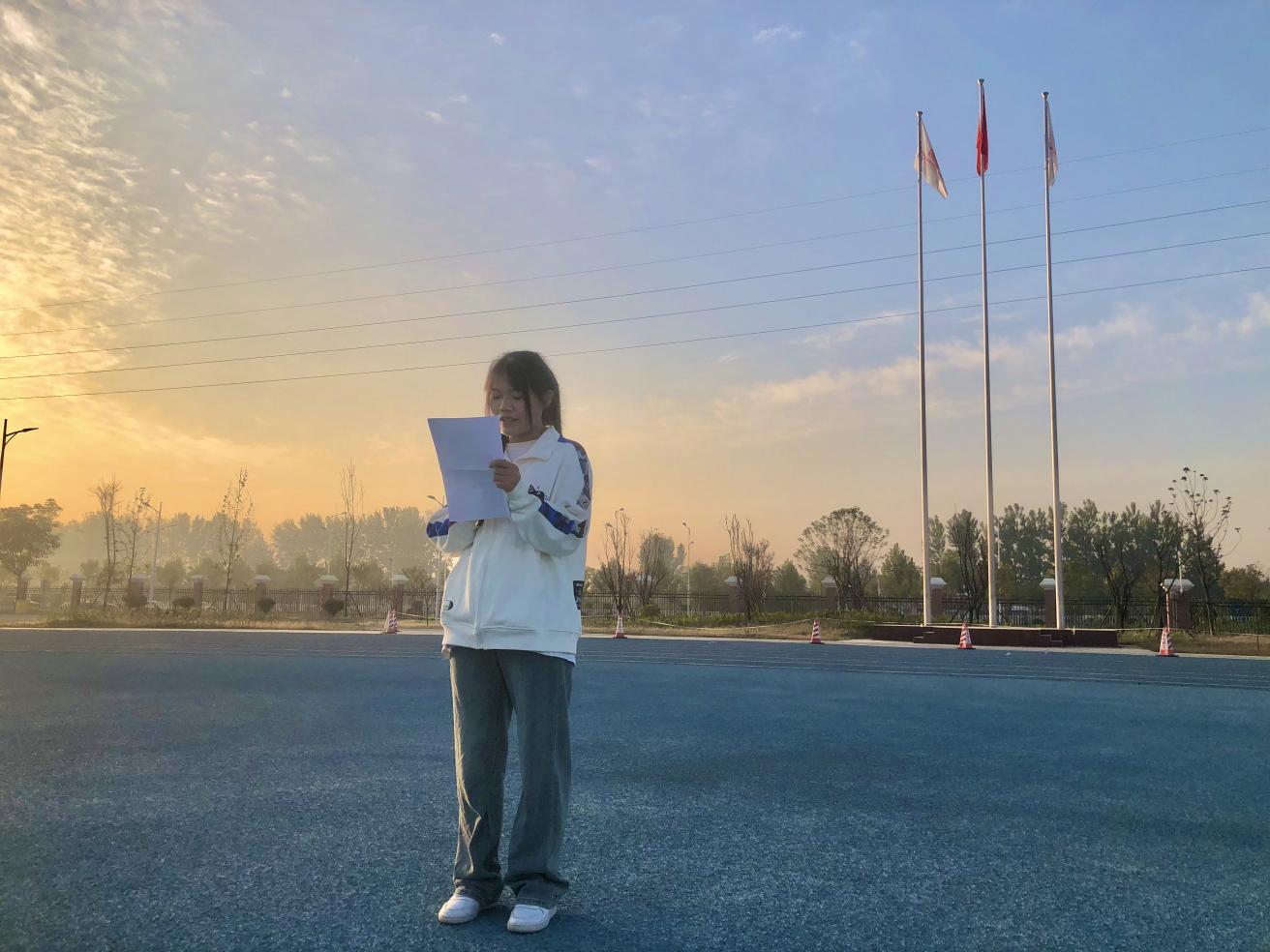 升旗完毕,新生专升本学生王灿作为学生代表发言,她说正处在人生黄金时期的大学生应该珍惜时间,热爱学习,努力成为社会主义的合格建设者和可靠接班人!让青春在全面建设社会主义现代化国家的火热实践中绽放绚丽之花。