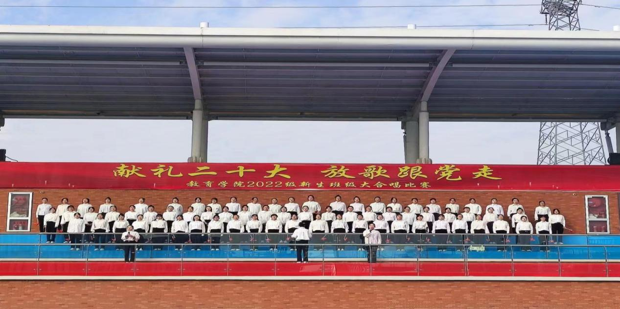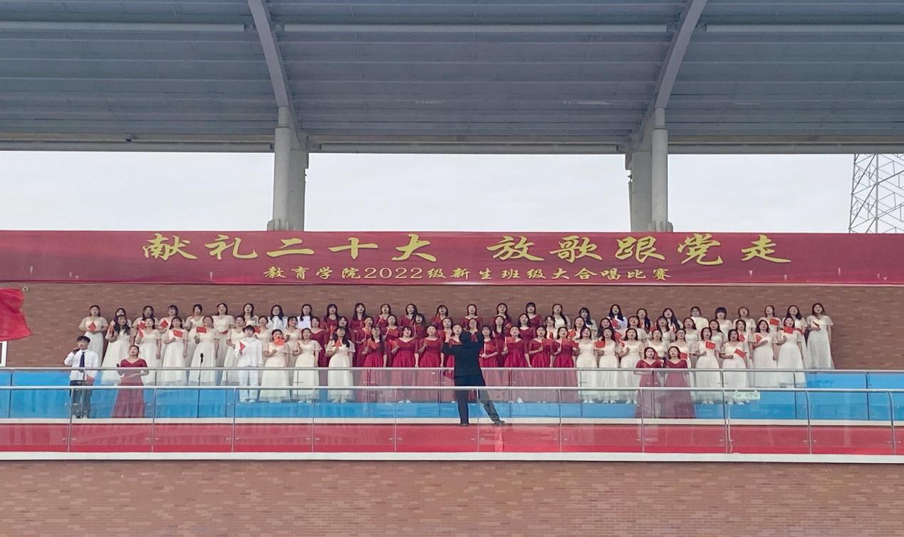 在全国上下认真学习贯彻党的二十大精神之际,教育学院为坚定青年大学生永远跟党走的理想和信念,引导学生赓续红色血脉,厚植爱国情怀,于11月6日上午在校户外操场举办了“献礼二十大,放歌跟党走”2022级新生班级大合唱比赛,莅临比赛现场的有学校副校长汪建利、教务处处长陈国平、后勤保卫处处长程坚、办公室副主任陈杰、教育学院院长王家云、副院长孟向红,校团委书记刘帅克、学生处老师、教育学院全体辅导员以及2022级49个班级的同学,学院2021级辅导员担任了本次大合唱比赛的评委。