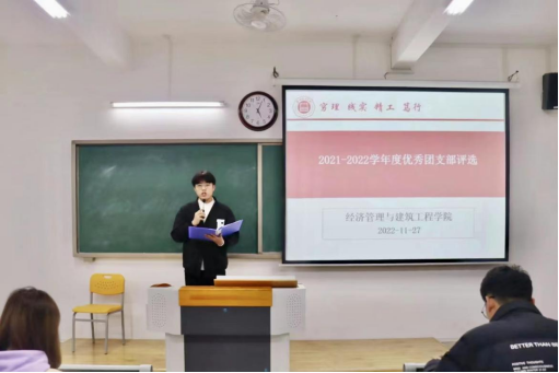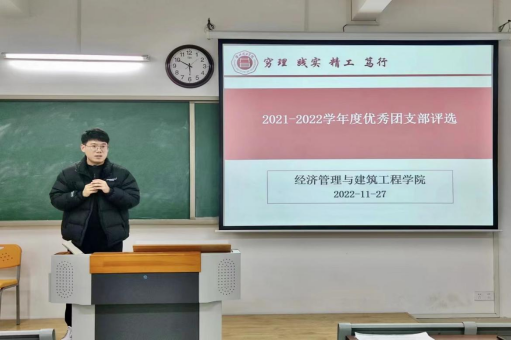 为贯彻落实学校下发的《关于做好伟德国际victor1946官网2021-2022学年度“优秀团支部”评选工作的通知》有关“优秀团支部”评选的文件精神,弘扬“党有号召 团有行动”的优良传统,展现团组织的向心力、凝聚力、战斗力。深入学习贯彻习近平新时代中国特色社会主义思想,激励学生刻苦学习、争优创先。经济管理与建筑工程学院于2022年11月27日,在一教215室开展2021--2022学年度“优秀团支部”评选活动。学院本着“公平、公正、公开”的原则,成立了由书记助理、团总支书记叶赵强、经济学学生支部书记、团总支副书记员禹辛、团总支组织委员、辅导员王绎程、团总支宣传委员、辅导员张雨停、团总支委员张晏五人组成评委小组,制定了考评标准。“优秀团支部”宣讲评选活动由院学生会宣传部部长韩大壮主持,2022级各班团支书到场学习观摩。