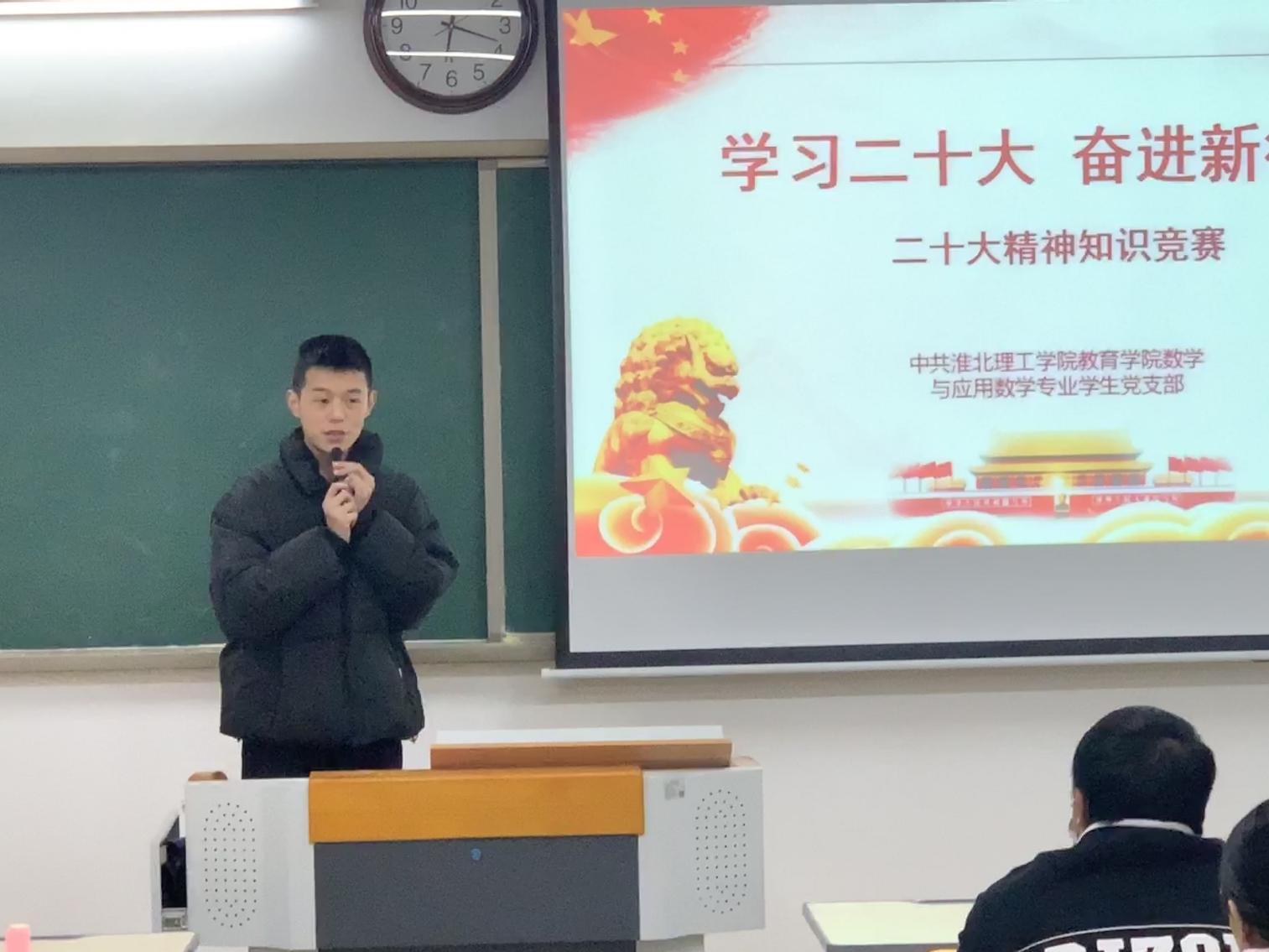 为深入学习宣传贯彻党的二十大精神,回顾党的光辉历史,推动党的二十大精神落地生根、入脑入心。教育学院数学与应用数学学生党支部积极部署,于12月1日在1教313开展“学习党的二十大精神知识竞赛活动”,活动由支部委员孙虎主持,支部书记陈媛媛、全体支部党员及入党积极分子参加了活动。