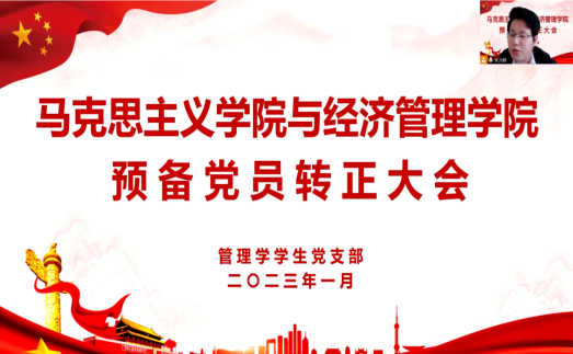 2023年1月6日上午,马克思主义学院与经济管理学院经济学、管理学学生党支部通过腾讯会议召开线上预备党员转正大会。校党委委员、学院党总支书记、院长吴玲同志,学院党总支青年委员、书记助理、团总支书记叶赵强同志出席大会,经济学、管理学学生党支部的全体党员参加大会。会议由经济学、管理学学生党支部组织委员朱元超、刘良晨主持。