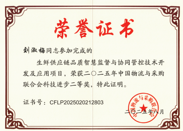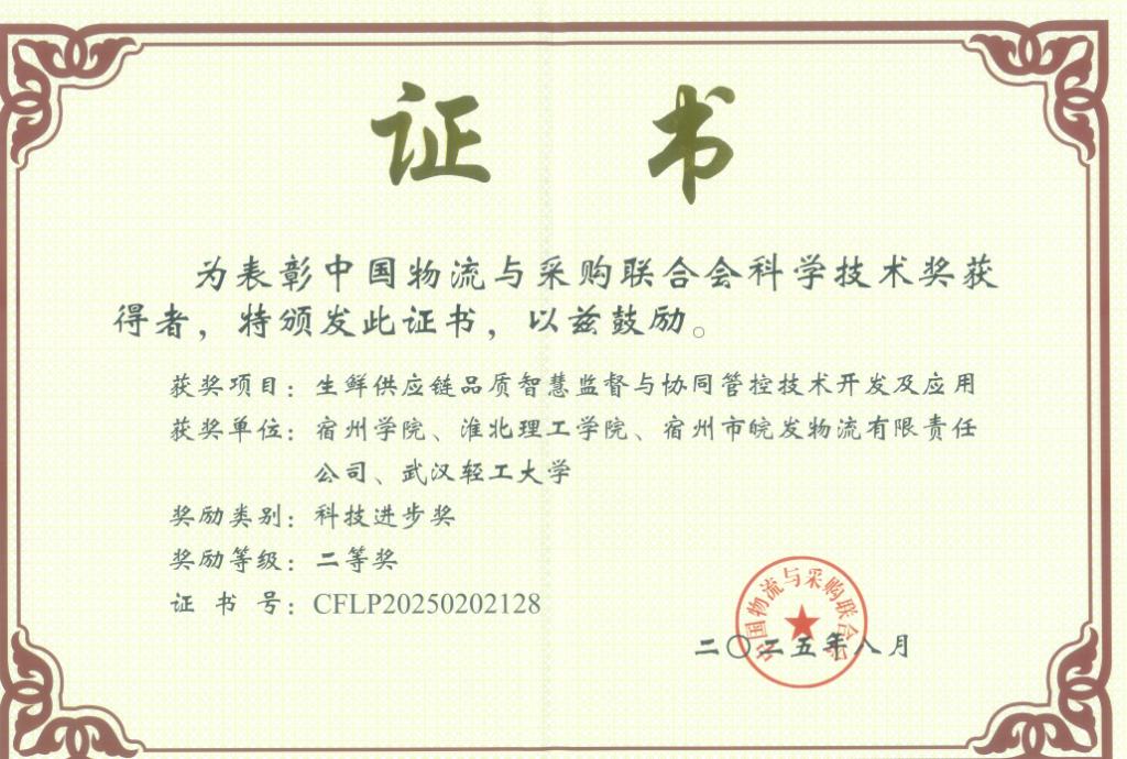 近日,2025 年度中国物流与采购联合会科学技术奖获奖名单揭晓,伟德作为第二完成单位与宿州学院、宿州市恒发物流有限责任公司、武汉轻工大学共同申报的“生鲜供应链品质智慧监督与协同管控技术开发及应用”项目,荣获科技进步奖二等奖。