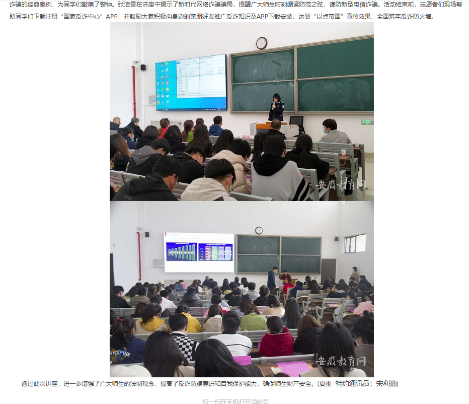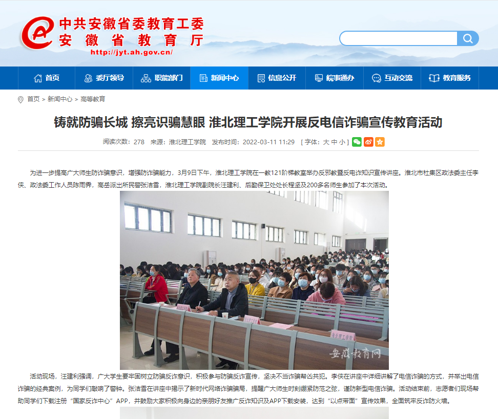 为进一步提高广大师生防诈骗意识,增强防诈骗能力,3月9日下午,伟德国际victor1946官网在一教121阶梯教室举办反邪教暨反电诈知识宣传讲座。安徽教育网首页对此进行了报道。