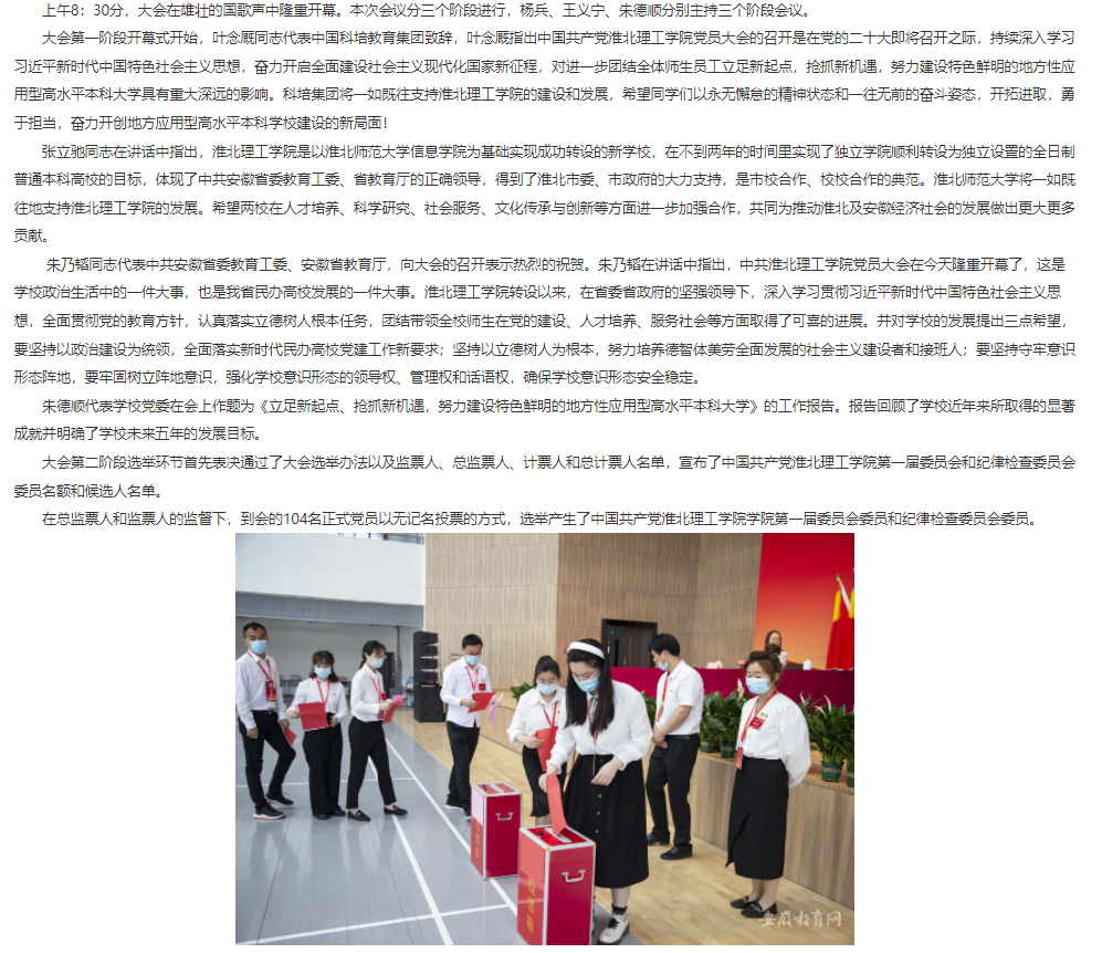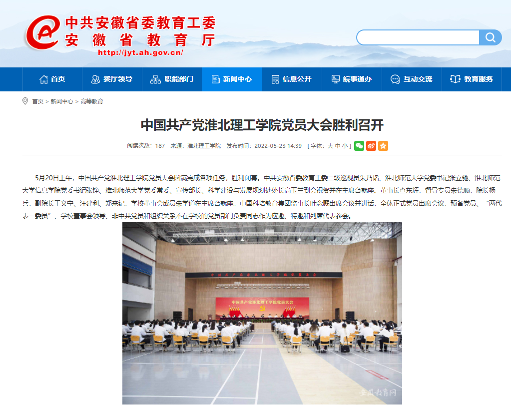 5月20日上午,中国共产党伟德国际victor1946官网党员大会圆满完成各项任务,胜利闭幕。安徽教育网对此进行了报道。