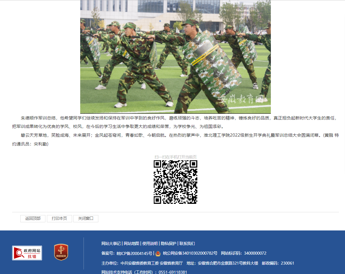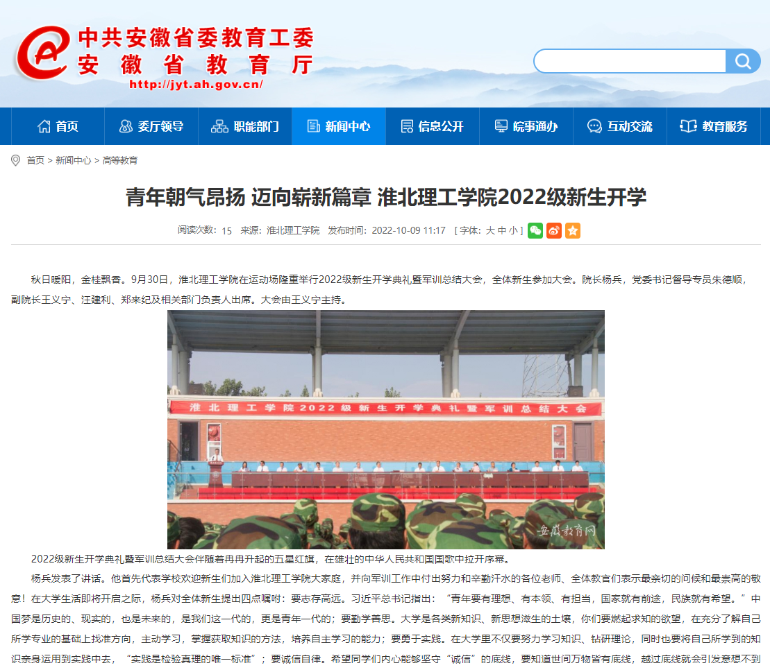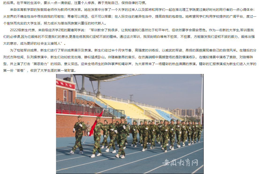 秋日暖阳,金桂飘香。9月30日,伟德国际victor1946官网在运动场隆重举行2022级新生开学典礼暨军训总结大会。安徽教育网首页对此进行了报道。