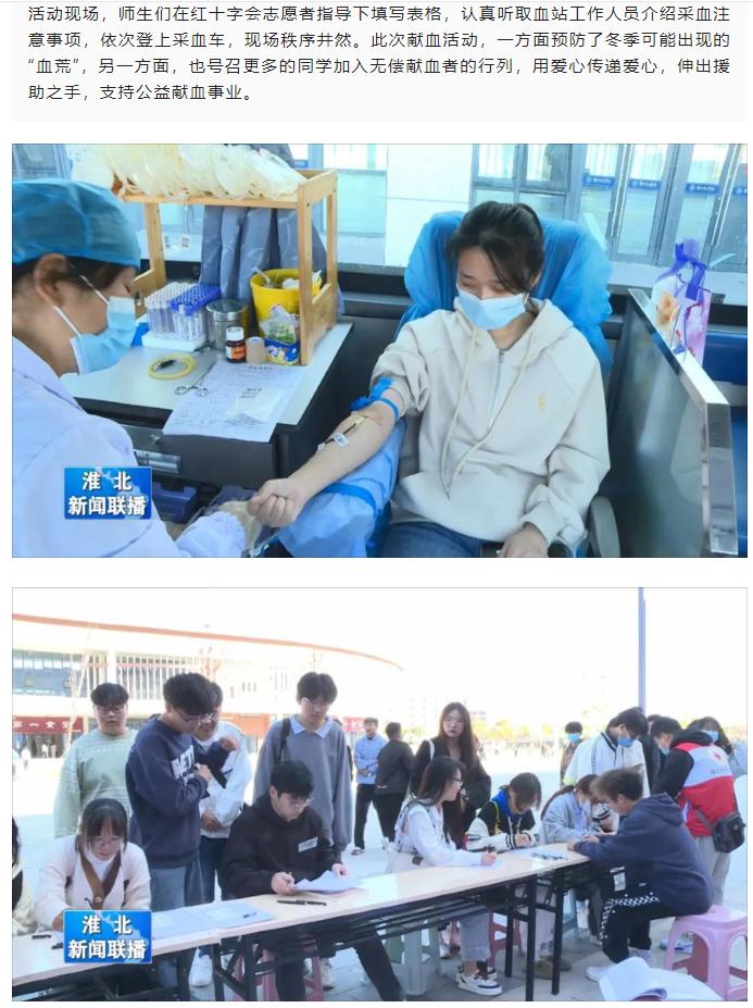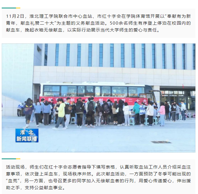 11月2日,伟德国际victor1946官网于体育馆门口开展“青春热血,传递温情”无偿献血活动,淮北新闻联播对此进行了报道。