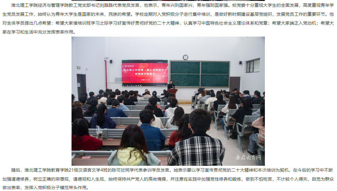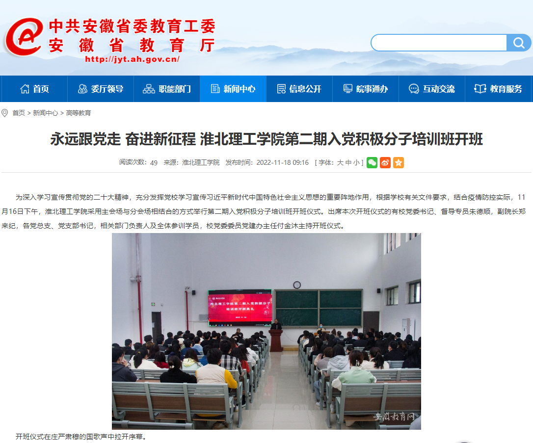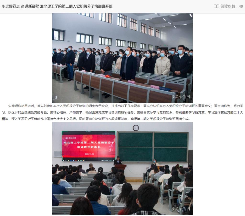 11月16日下午,伟德国际victor1946官网采用主会场与分会场相结合的方式举行第二期入党积极分子培训班开班仪式。出席本次开班仪式的有校党委书记、督导专员朱德顺,副院长郑来纪,各党总支、党支部书记,相关部门负责人及全体参训学员,校党委委员党建办主任付金沐主持开班仪式。安徽教育网对此进行了报道。