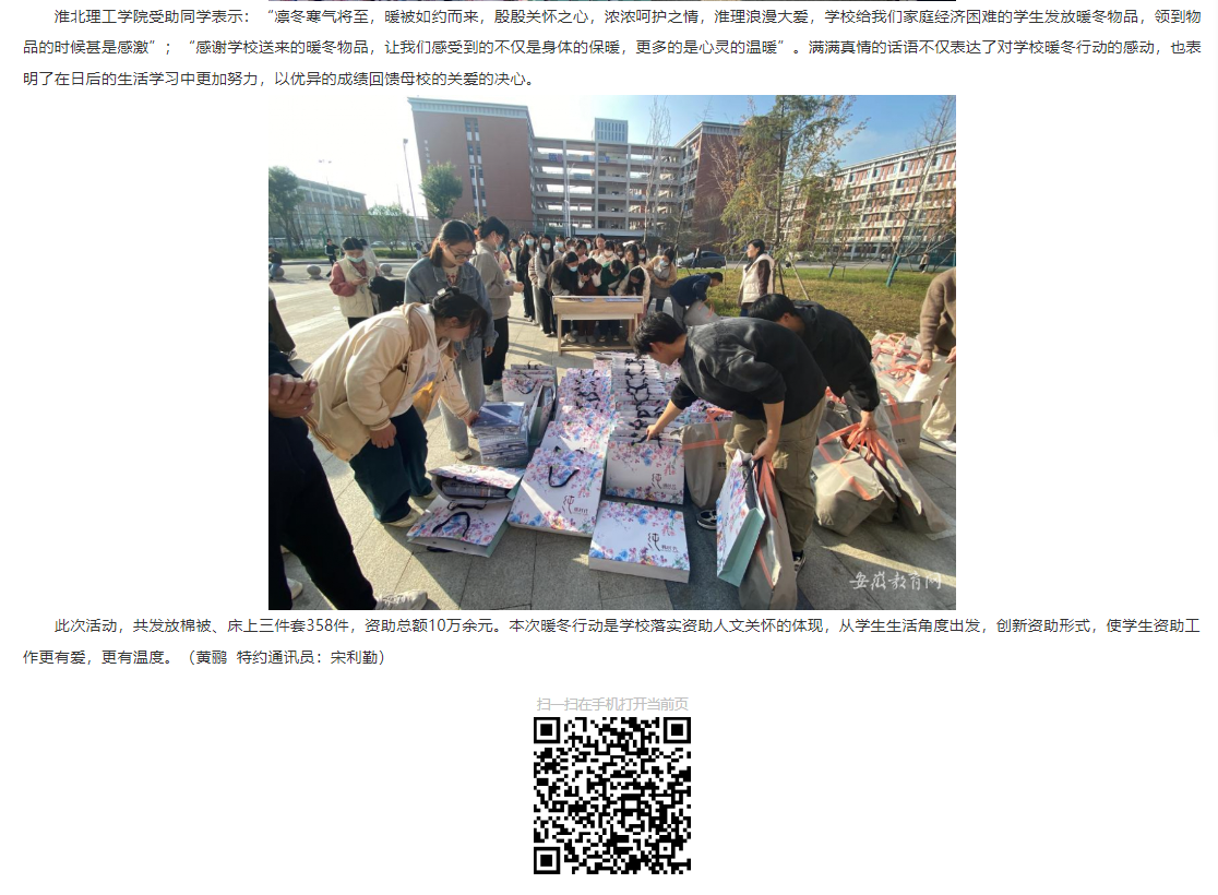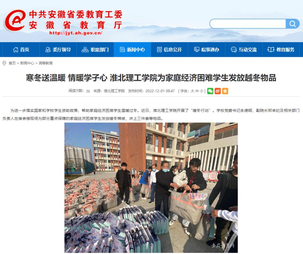为进一步落实国家和学校学生资助政策,帮助家庭经济困难学生温暖过冬。近日,伟德国际victor1946官网开展了“暖冬行动”。学校党委书记朱德顺、副院长郑来纪及相关部门负责人在宿舍楼现场为部分重点保障的家庭经济困难学生发放暖冬棉被、床上三件套等物品。安徽教育网首页对此进行了报道。