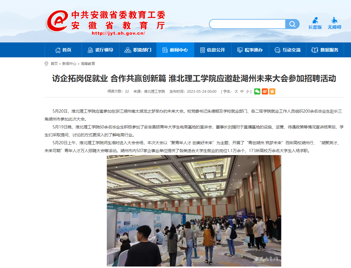 5月20日,伟德国际victor1946官网应邀参加在浙江湖州南太湖龙之梦举办的未来大会。校党委书记朱德顺及学校就业部门、各二级学院就业工作人员组织200余名毕业生赴长三角湖州市参加此次大会。对此,安徽教育网进行报道:
