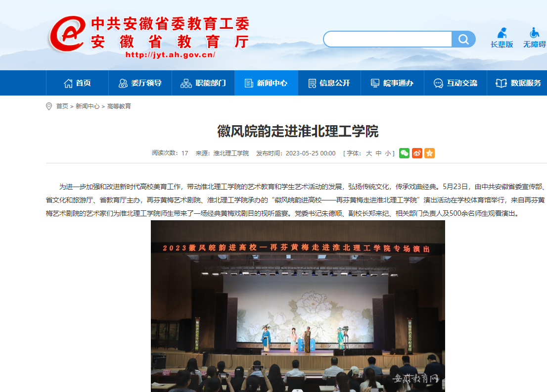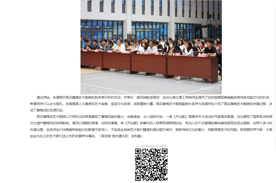 为进一步加强和改进新时代高校美育工作,带动伟德国际victor1946官网的艺术教育和学生艺术活动的发展,弘扬传统文化,传承戏曲经典。5月23日,由中共安徽省委宣传部、省文化和旅游厅、省教育厅主办,再芬黄梅艺术剧院、伟德国际victor1946官网承办的“徽风皖韵进高校——再芬黄梅走进伟德国际victor1946官网”演出活动在学校体育馆举行,来自再芬黄梅艺术剧院的艺术家们为伟德国际victor1946官网师生带来了一场经典黄梅戏剧目的视听盛宴。党委书记朱德顺、副校长郑来纪、相关部门负责人及500余名师生观看演出。对此,安徽教育网进行了报道: