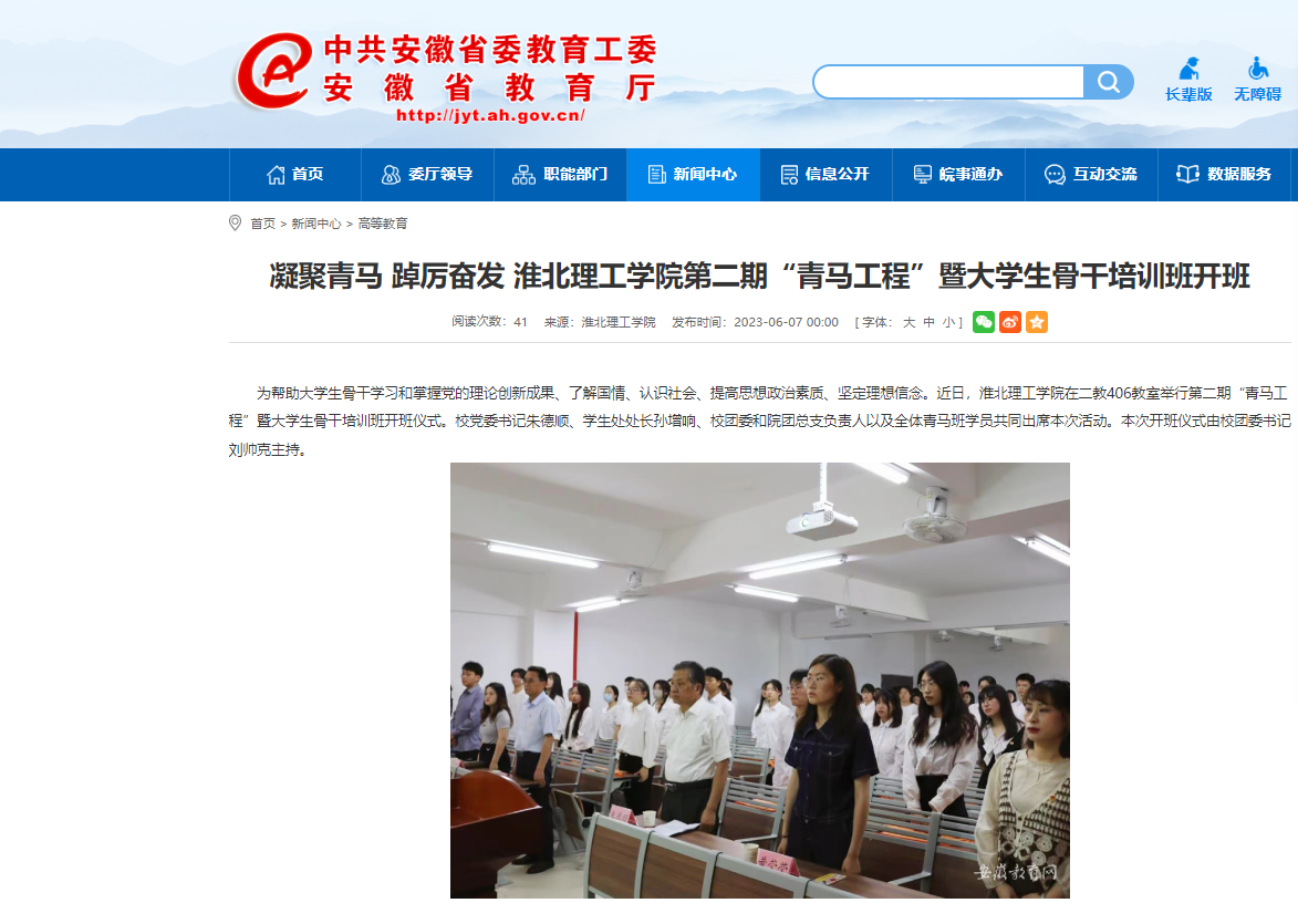 为帮助大学生骨干学习和掌握党的理论创新成果、了解国情、认识社会、提高思想政治素质、坚定理想信念。近日,伟德国际victor1946官网在二教406教室举行第二期“青马工程”暨大学生骨干培训班开班仪式。对此,安徽教育网作了报道: