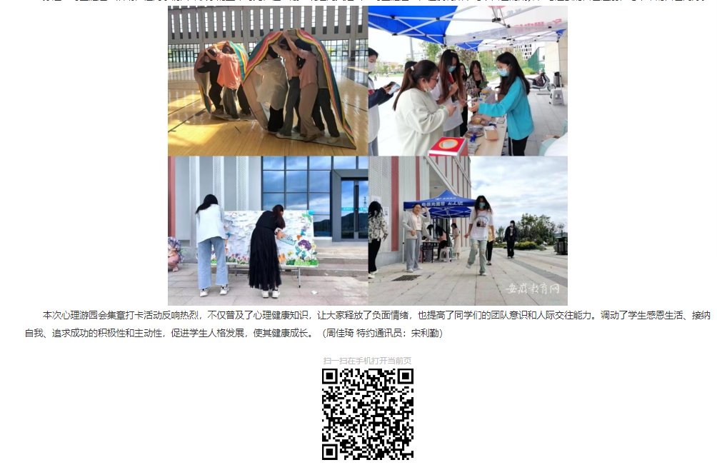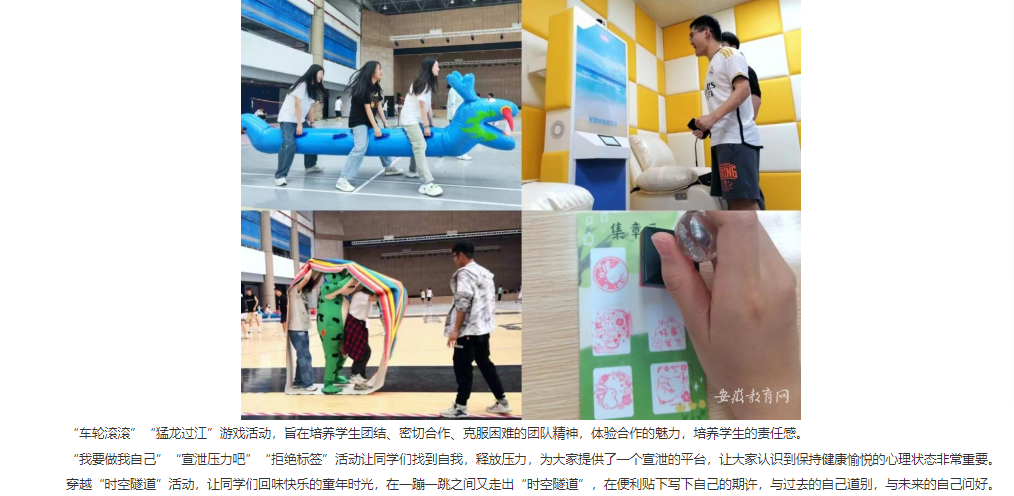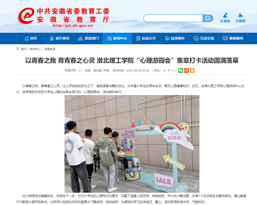 以青春之我,育青春之心灵。让心灵绽放在阳光之下,接受温暖与爱的洗礼。为丰富大学生的课余生活,普及心理健康知识,近日,由伟德国际victor1946官网心理咨询中心主办,各学院团总支和大学生心理协会联合承办的“心理游园会”活动顺利举行。对此,安徽教育网作了报道: