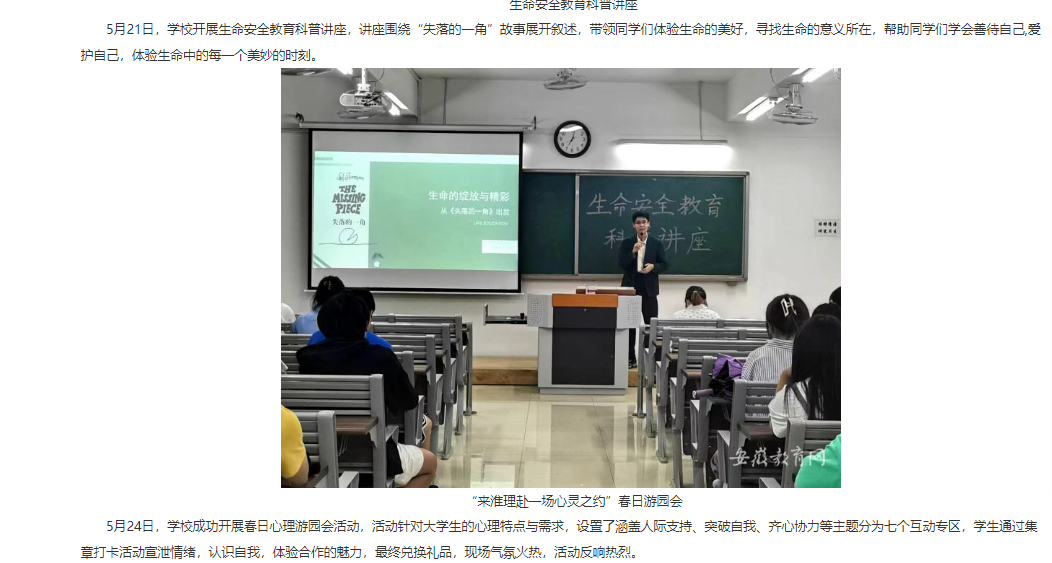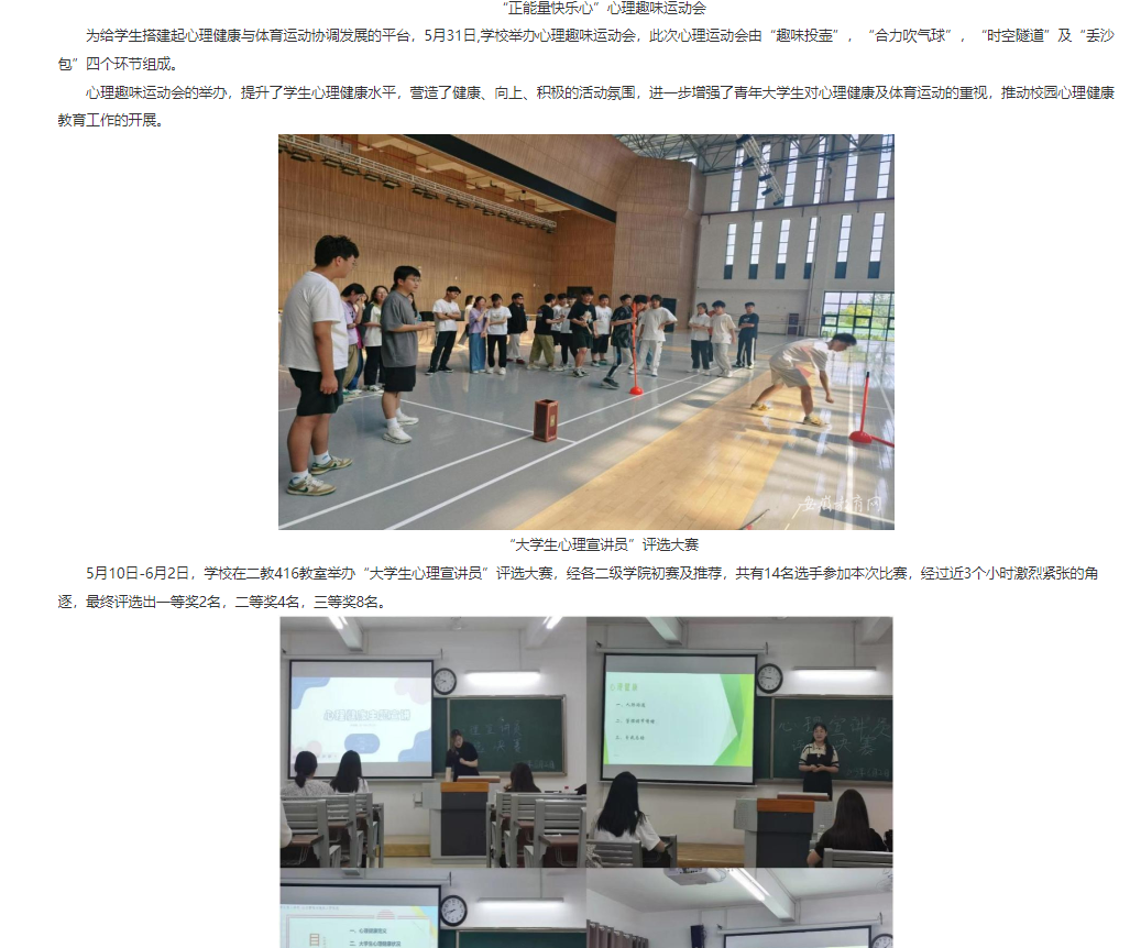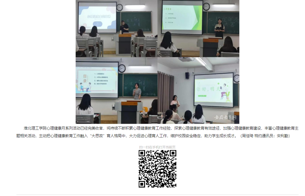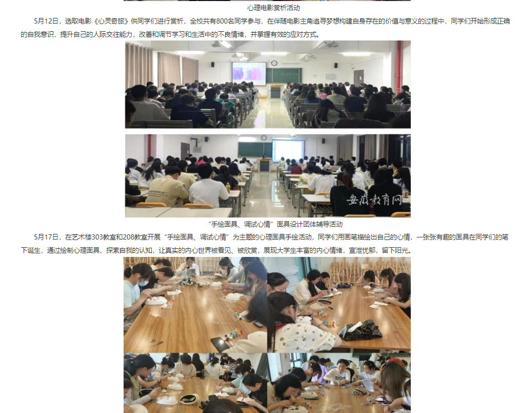 为引导学生养成积极乐观的阳光心态及奋发向上的意志品质,促进学生身心健康协调发展,开展有针对性的心理健康宣传教育,进一步提升心理育人工作的有效性与感染力,近日,伟德国际victor1946官网心理健康教育与咨询中心开展了“来淮理赴一场心灵之约”为主题的心理健康月系列活动。对此,安徽教育网首页进行了报道: