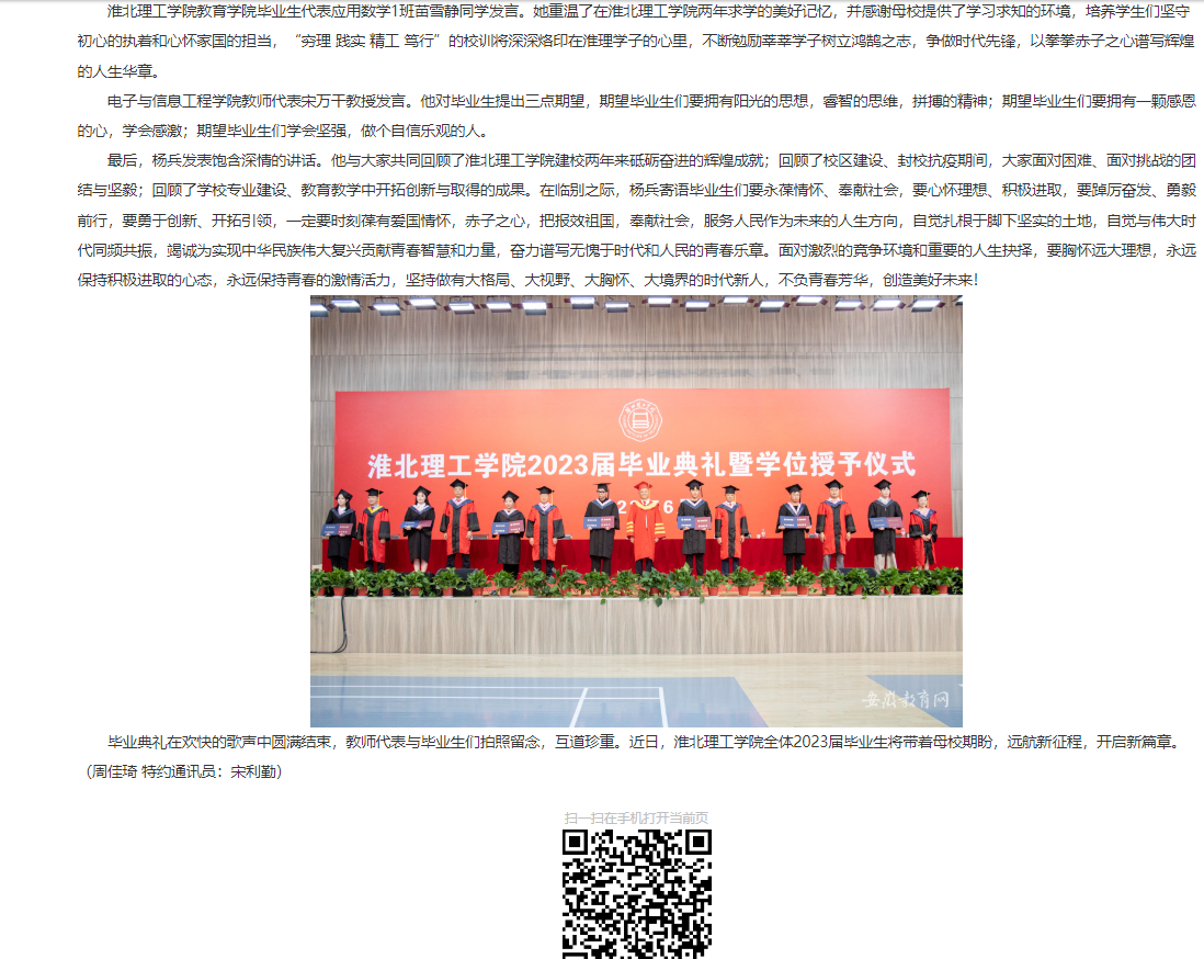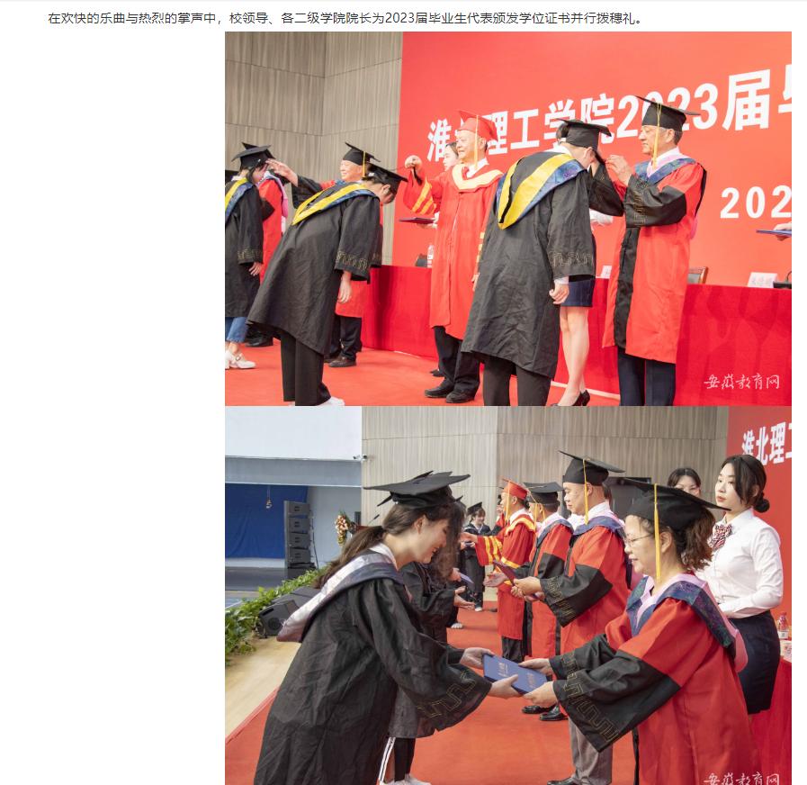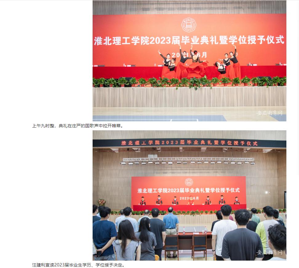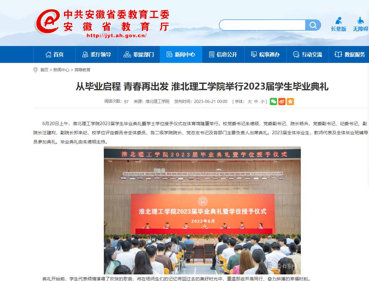 6月20日上午,伟德国际victor1946官网2023届学生毕业典礼暨学士学位授予仪式在体育馆隆重举行。校党委书记朱德顺,党委副书记、院长杨兵,党委副书记、纪委书记、副院长汪建利,副院长郑来纪,校学位评定委员会全体委员,各二级学院院长、党总支书记及各部门主要负责人出席典礼。2023届全体毕业生,教师代表及全体毕业班辅导员参加典礼。毕业典礼由朱德顺主持。对此,安徽教育网作了报道: