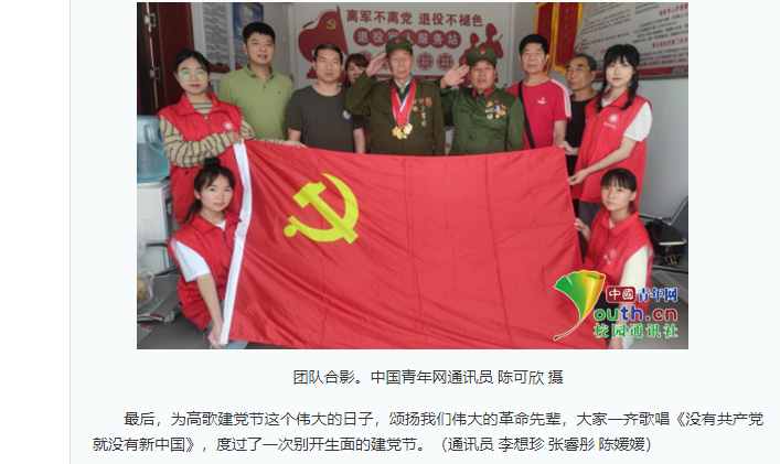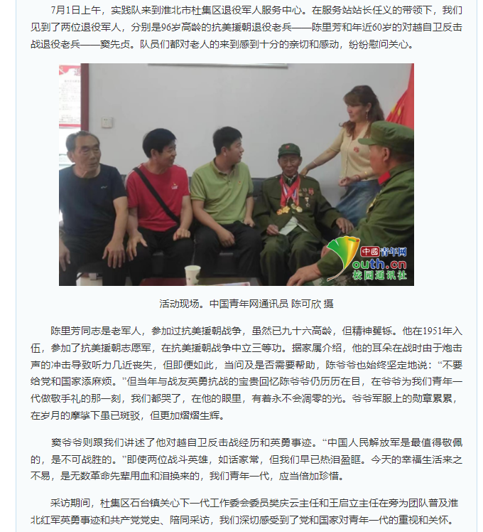 2023年6月28日至7月5日,伟德国际victor1946官网教育学院学子“团心向党·寻红怀烈”——伟德国际victor1946官网大学生赴淮北各区、县、镇关怀退伍老兵,学习革命先烈精神暑期社会实践团队,淮北革命故地开展为期一周的暑期“三下乡”社会实践活动。本次实践活动主要从参观淮北红色博物馆与革命遗址、慰问英勇红军重温红色战役以及普及红色文化和党史三个方面进行调研学习。对此,中青网作了报道: