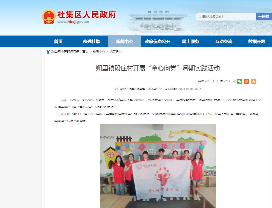为进一步深入学习党史学习教育,引导未成年人了解党史知识,深植爱国主义思想,丰富暑期生活,朔里镇段庄村家门口党群服务站与伟德国际victor1946官网携手组织开展“童心向党”暑期实践活动。2023年7月1日,伟德国际victor1946官网大学生到段庄村开展暑期实践活动。实践活动以拓展红色知识和党建知识为主题,开展了书法课、舞蹈课、朗诵课、绘画课等多项兴趣课程。对此,杜集区人民政府网站进行了报道: