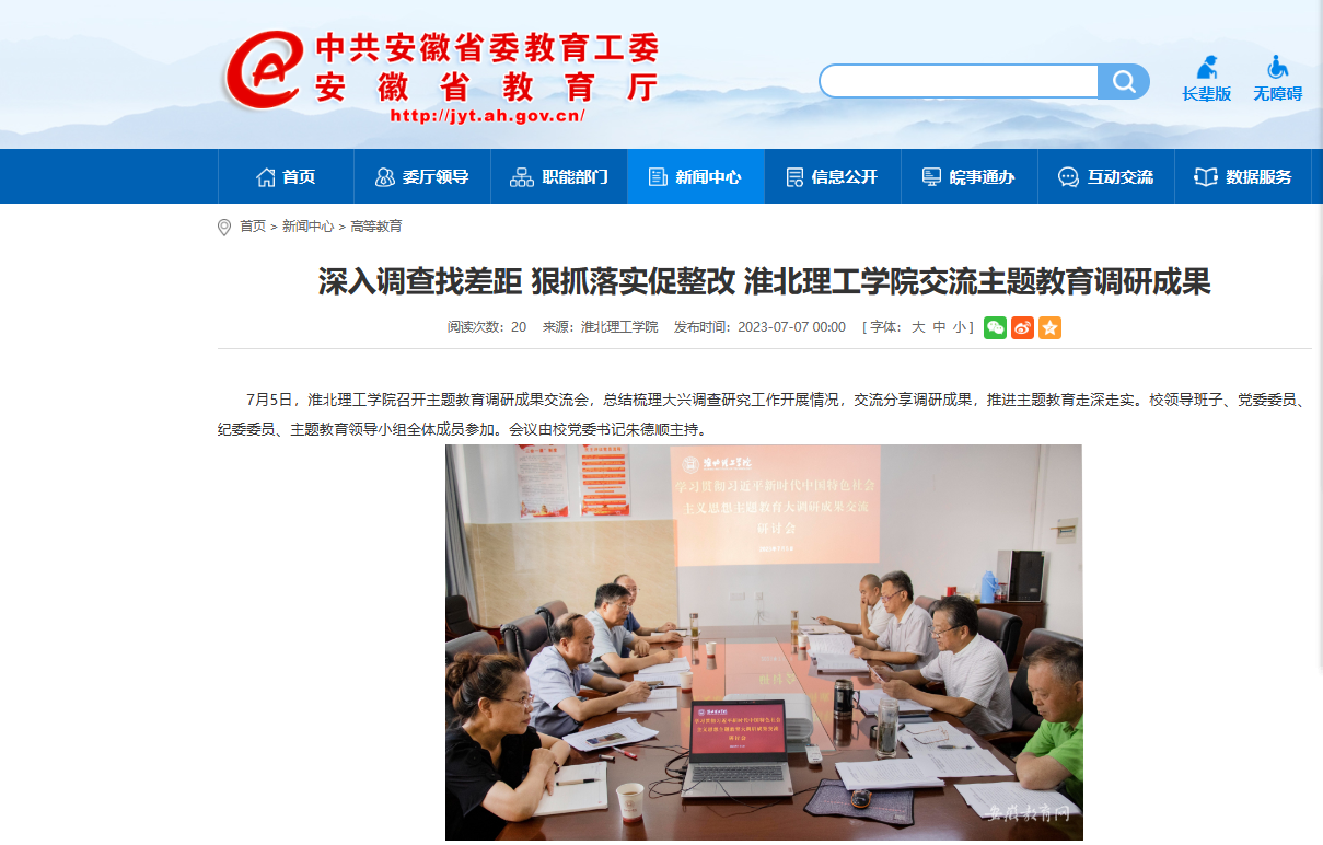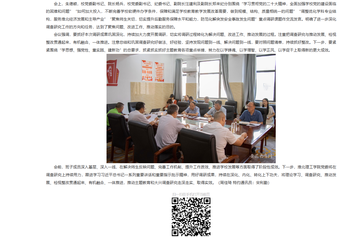 7月5日,伟德国际victor1946官网召开主题教育调研成果交流会,总结梳理大兴调查研究工作开展情况,交流分享调研成果,推进主题教育走深走实。校领导班子、党委委员、纪委委员、主题教育领导小组全体成员参加。会议由校党委书记朱德顺主持。对此,安徽教育网进行了报道: