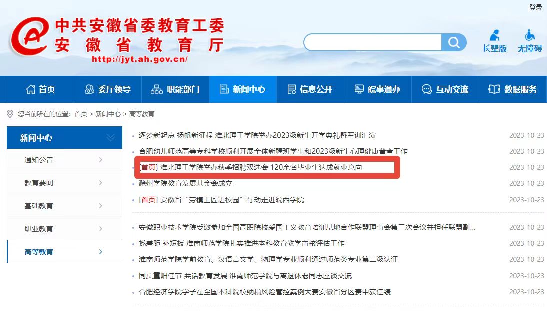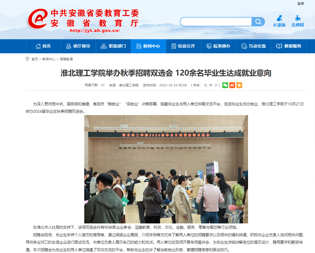 为深入贯彻党中央、国务院和省委、省政府“稳就业”“保就业”决策部署,搭建毕业生与用人单位供需交流平台,促进毕业生充分就业,伟德国际victor1946官网于10月21日举办2024届毕业生秋季招聘双选会。对此。安徽教育网首页进行了报道: