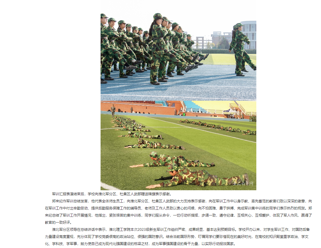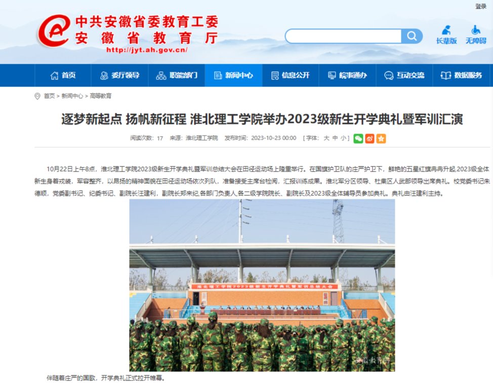 10月22日上午8点,伟德国际victor1946官网2023级新生开学典礼暨军训总结大会在田径运动场上隆重举行。在国旗护卫队的庄严护卫下,鲜艳的五星红旗冉冉升起,2023级全体新生身着戎装,军容整齐,以昂扬的精神面貌在田径运动场依次列队,准备接受主席台检阅,汇报训练成果。对此,安徽教育网进行了报道:
