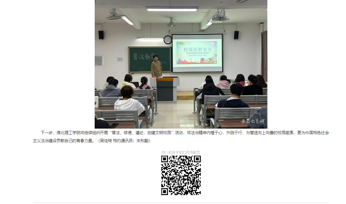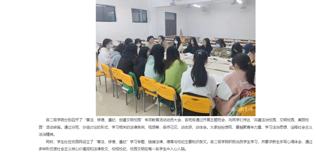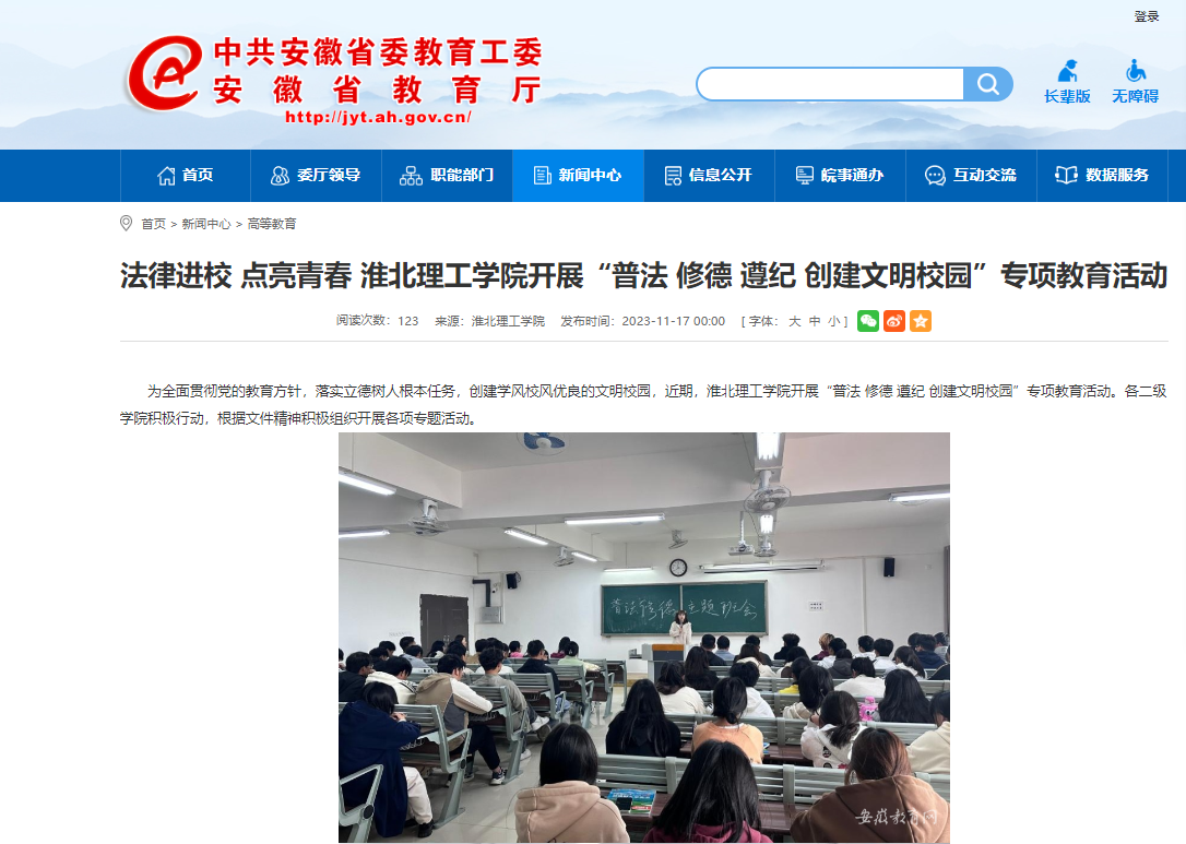 为全面贯彻党的教育方针,落实立德树人根本任务,创建学风校风优良的文明校园,近期,伟德国际victor1946官网开展“普法 修德 遵纪 创建文明校园”专项教育活动。各二级学院积极行动,根据文件精神积极组织开展各项专题活动。对此,安徽教育网首页进行了报道: