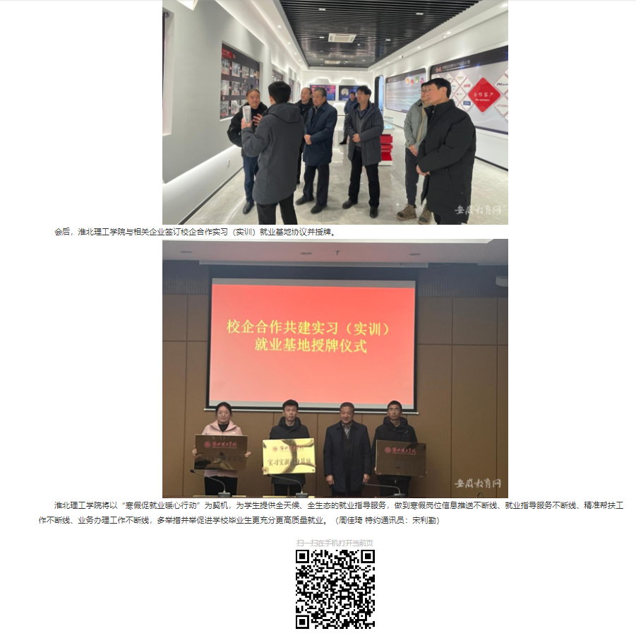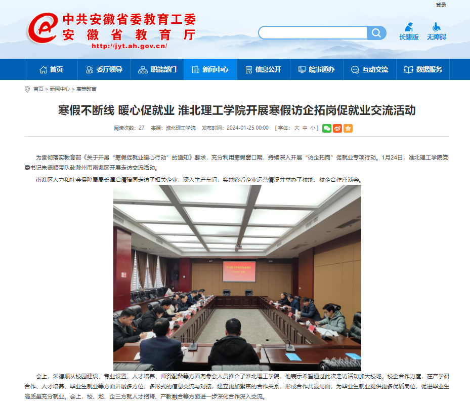 为贯彻落实教育部《关于开展“寒假促就业暖心行动”的通知》要求,充分利用寒假窗口期,持续深入开展“访企拓岗”促就业专项行动。1月24日,伟德国际victor1946官网党委书记朱德顺带队赴滁州市南谯区开展走访交流活动。对此,安徽教育网进行了报道:
