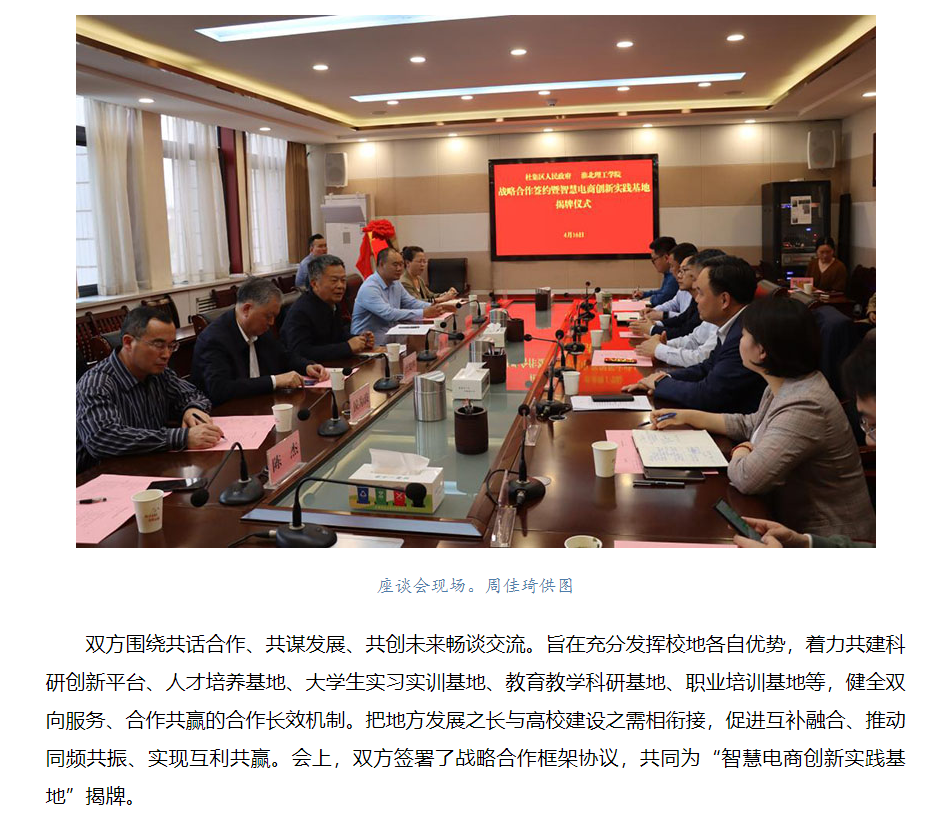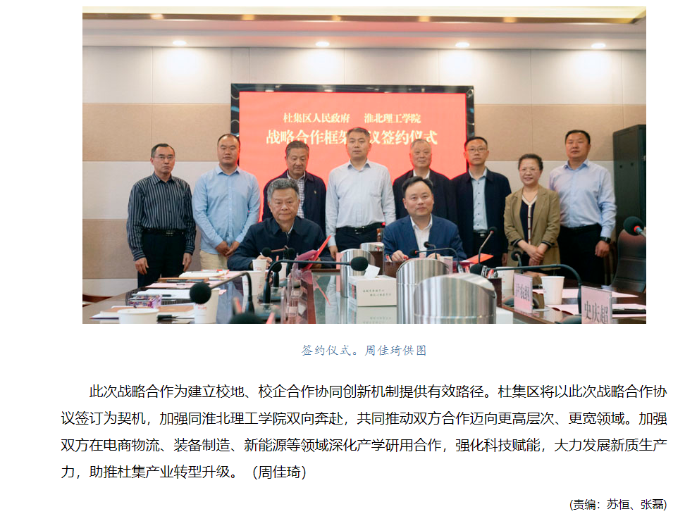 为加强校地深度融合,不断开创校地、校企合作新局面,4月16日下午,淮北市杜集区人民政府与伟德国际victor1946官网战略合作签约暨智慧电商创新实践基地揭牌仪式在杜集区政府会议室举行。对此,人民网-安徽频道进行了报道: