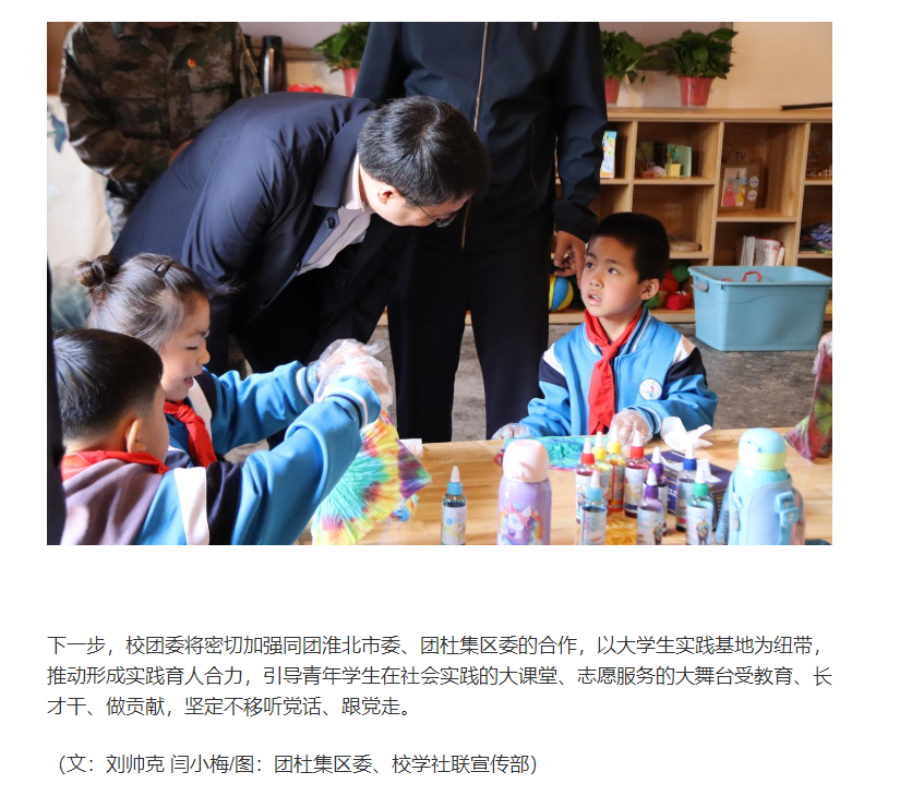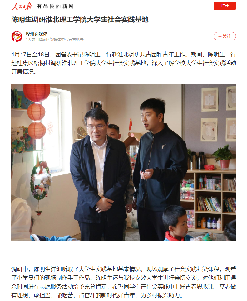 4月17日至18日,团省委书记陈明生一行赴淮北调研共青团和青年工作。期间,陈明生一行赴杜集区梧桐村调研伟德国际victor1946官网大学生社会实践基地,深入了解学校大学生社会实践活动开展情况。对此,人民日报进行了报道: