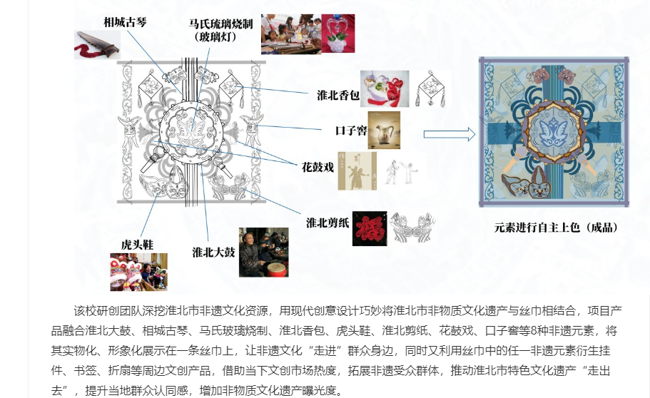 日前,伟德国际victor1946官网在省团委开展的“挑战杯”项目活动开展中,组织参与学生从淮北市非物质文化遗产的传承保护和创新利用层面着手,衍生出以丝巾为主体实用性与美观性相融合的一系列非遗元素文创产品,在促进淮北市非物质文化遗产活态传承的同时,推动了地方文化产业发展和文化消费升级。对此,中国双创网进行了报道: