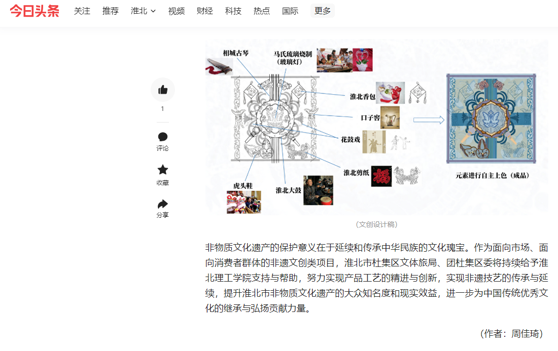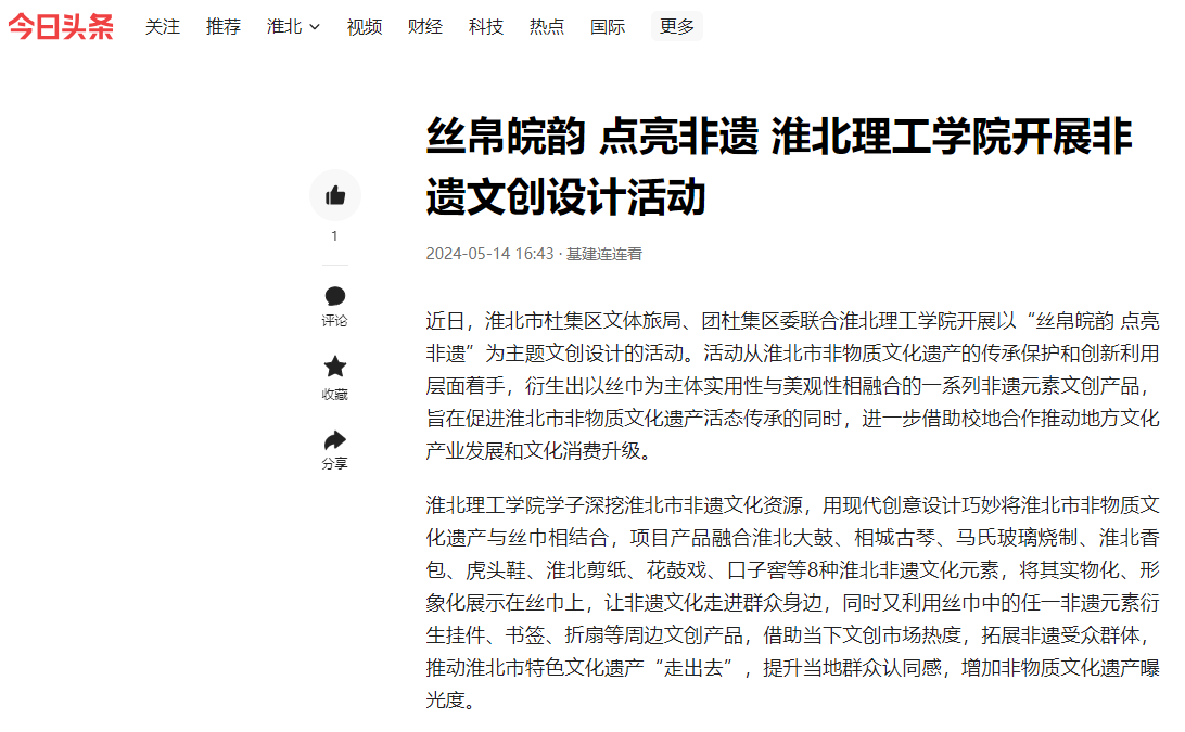 近日,淮北市杜集区文体旅局、团杜集区委联合伟德国际victor1946官网开展以“丝帛皖韵 点亮非遗”为主题文创设计的活动。对此,今日头条进行了报道: