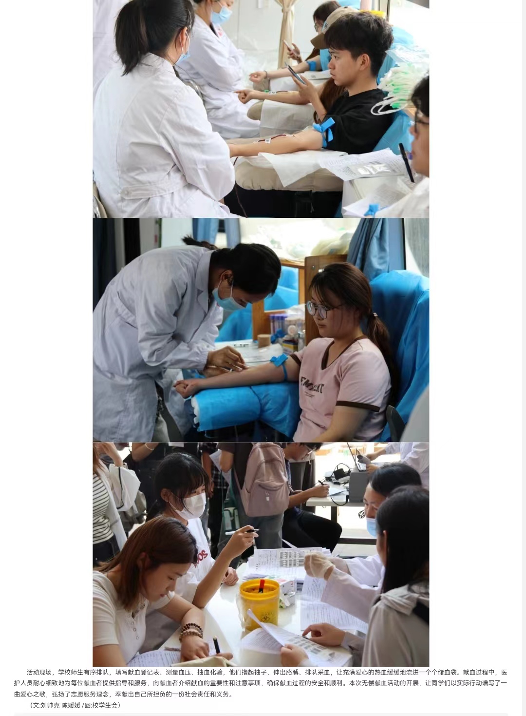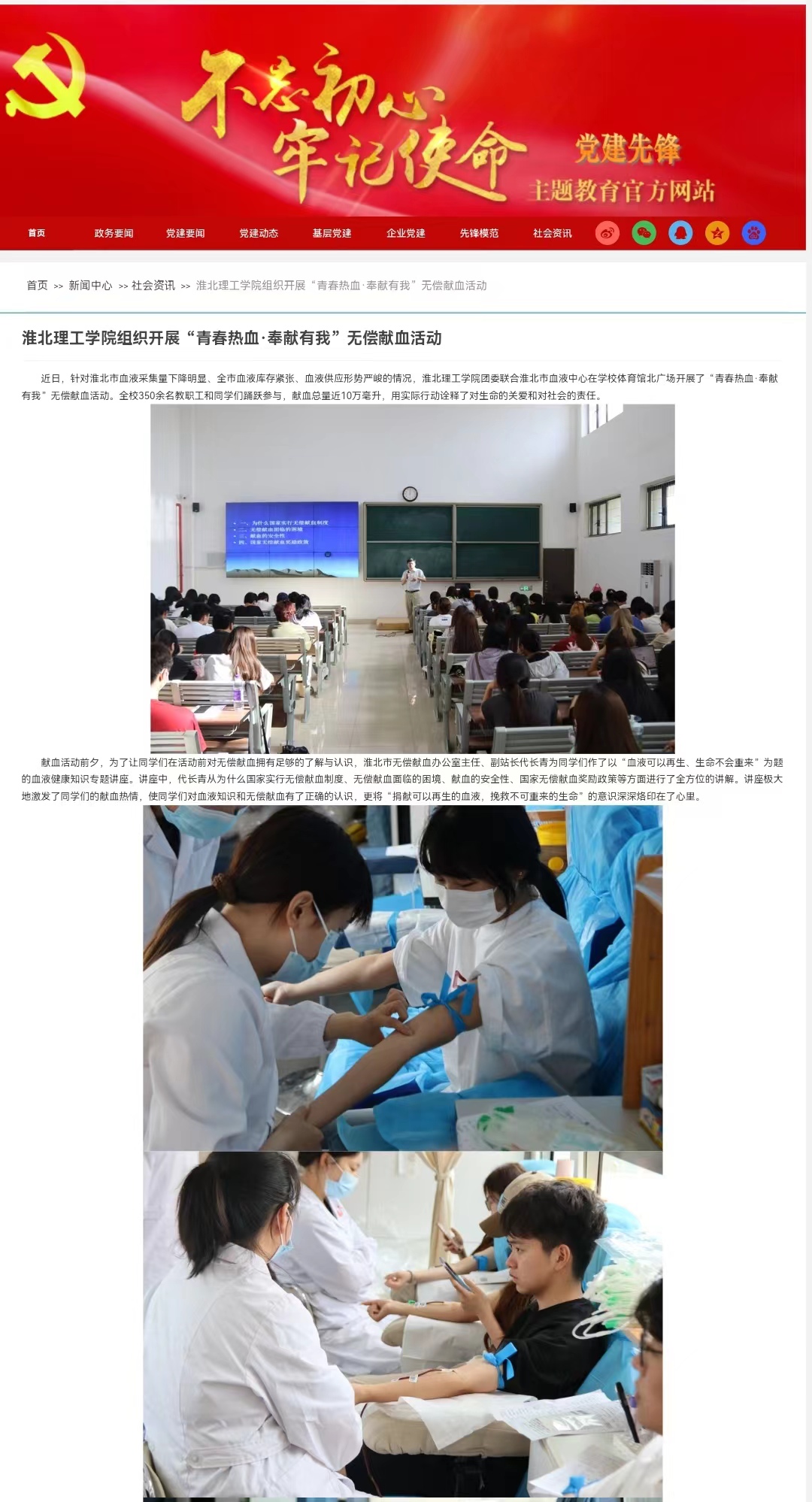 近日,针对淮北市血液采集量下降明显、全市血液库存紧张、血液供应形势严峻的情况,伟德国际victor1946官网团委联合淮北市血液中心在学校体育馆北广场开展了“青春热血·奉献有我”无偿献血活动。全校350余名教职工和同学们踊跃参与,献血总量近10万毫升,用实际行动诠释了对生命的关爱和对社会的责任。对此,党建先锋主题教育官方网站进行了报道: