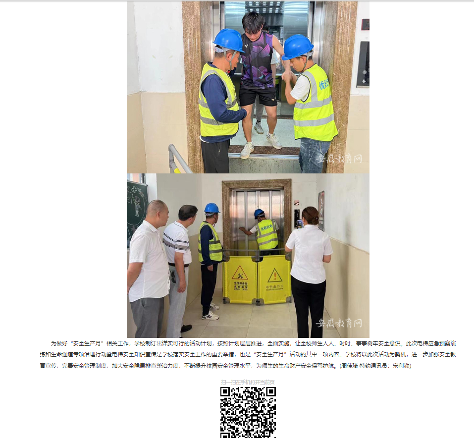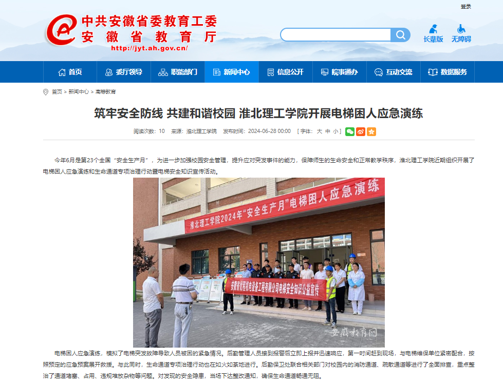 今年6月是第23个全国“安全生产月”,为进一步加强校园安全管理,提升应对突发事件的能力,保障师生的生命安全和正常教学秩序,伟德国际victor1946官网近期组织开展了电梯困人应急演练和生命通道专项治理行动暨电梯安全知识宣传活动。对此,安徽教育网首页进行了报道: