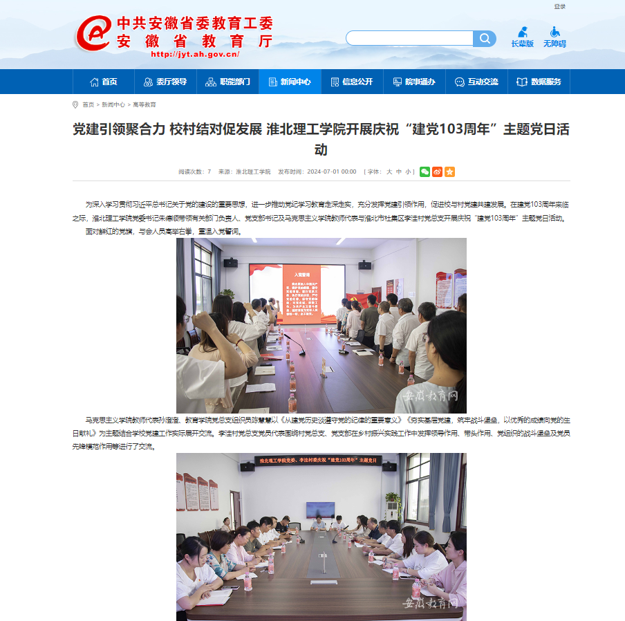 为深入学习贯彻习近平总书记关于党的建设的重要思想,进一步推动党纪学习教育走深走实,充分发挥党建引领作用,促进校与村党建共建发展。在建党103周年来临之际,伟德国际victor1946官网党委书记朱德顺带领有关部门负责人、党支部书记及马克思主义学院教师代表与淮北市杜集区李洼村党总支开展庆祝“建党103周年”主题党日活动。对此,安徽教育网进行了报道: