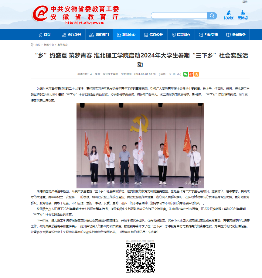 为深入学习宣传贯彻党的二十大精神,贯彻落实习近平总书记关于青年工作的重要思想,引领广大团员青年在社会课堂中受教育、长才干、作贡献。近日,伟德国际victor1946官网举行2024年大学生暑期“三下乡”社会实践活动启动仪式。校党委书记朱德顺、相关部门负责人、各二级学院团总支书记、副书记、“三下乡”团队指导教师、学生志愿者代表出席仪式。对此,安徽教育网进行了报道: