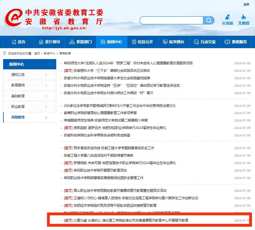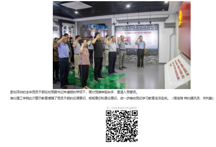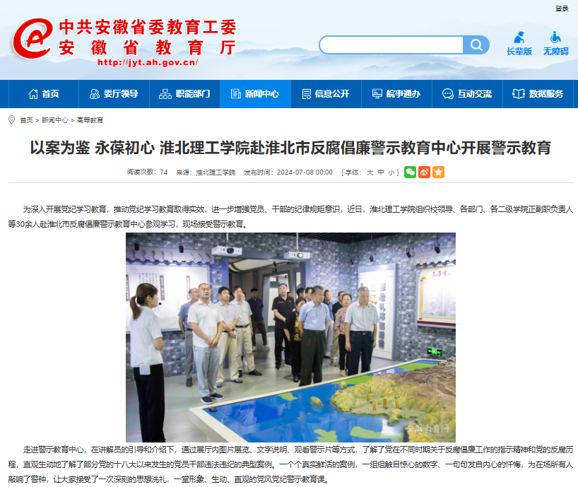 为深入开展党纪学习教育,推动党纪学习教育取得实效,进一步增强党员、干部的纪律规矩意识,近日,伟德国际victor1946官网组织校领导、各部门、各二级学院正副职负责人等30余人赴淮北市反腐倡廉警示教育中心参观学习,现场接受警示教育。安徽教育网首页对此进行了报道。