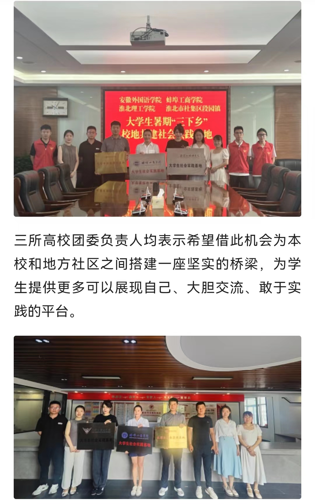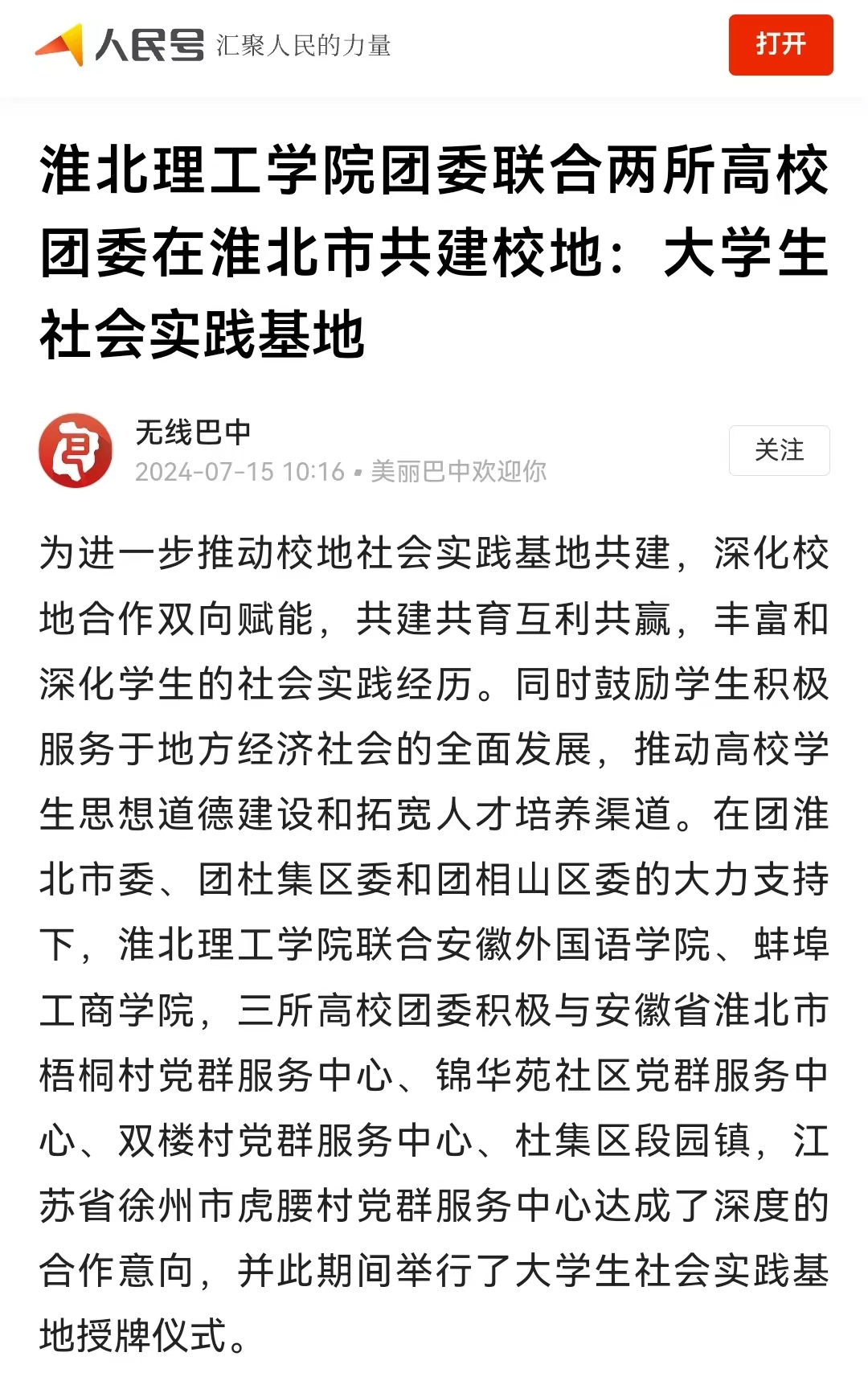 为进一步推动校地社会实践基地共建,深化校地合作双向赋能,共建共育互利共赢,丰富和深化学生的社会实践经历。同时鼓励学生积极服务于地方经济社会的全面发展,推动高校学生思想道德建设和拓宽人才培养渠道。在团淮北市委、团杜集区委和团相山区委的大力支持下,伟德国际victor1946官网联合安徽外国语学院、蚌埠工商学院,三所高校团委积极与安徽省淮北市梧桐村党群服务中心、锦华苑社区党群服务中心、双楼村党群服务中心、杜集区段园镇,江苏省徐州市虎腰村党群服务中心达成了深度的合作意向,并此期间举行了大学生社会实践基地授牌仪式。对此,人民日报-人民号进行了报道: